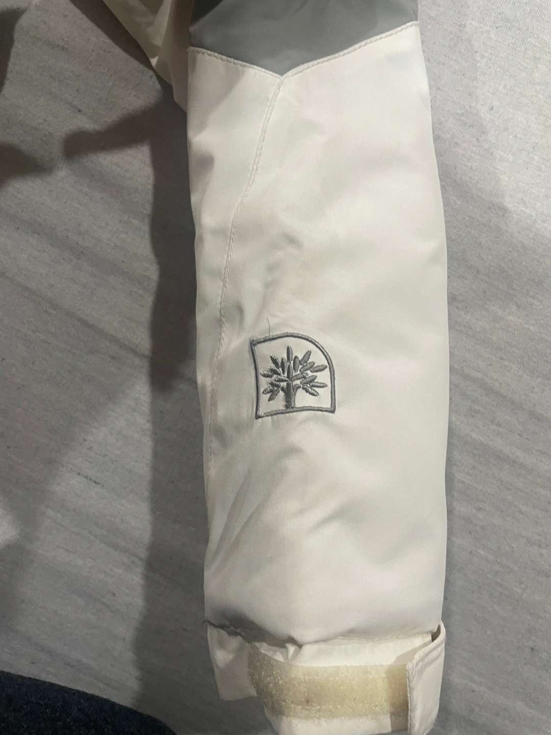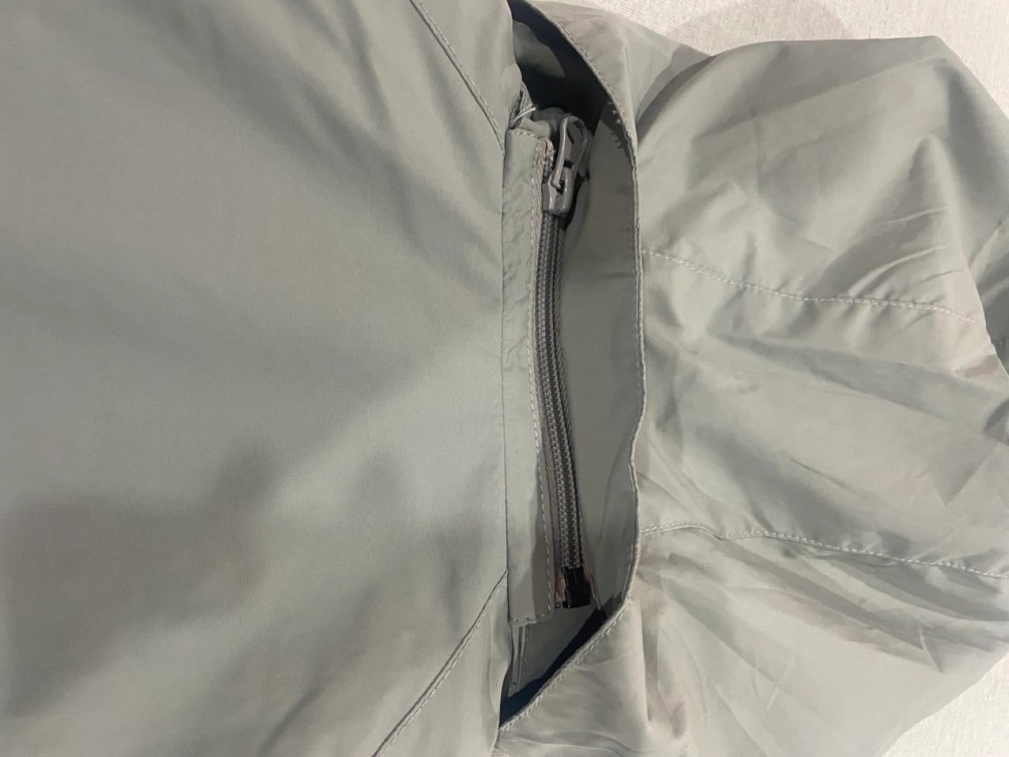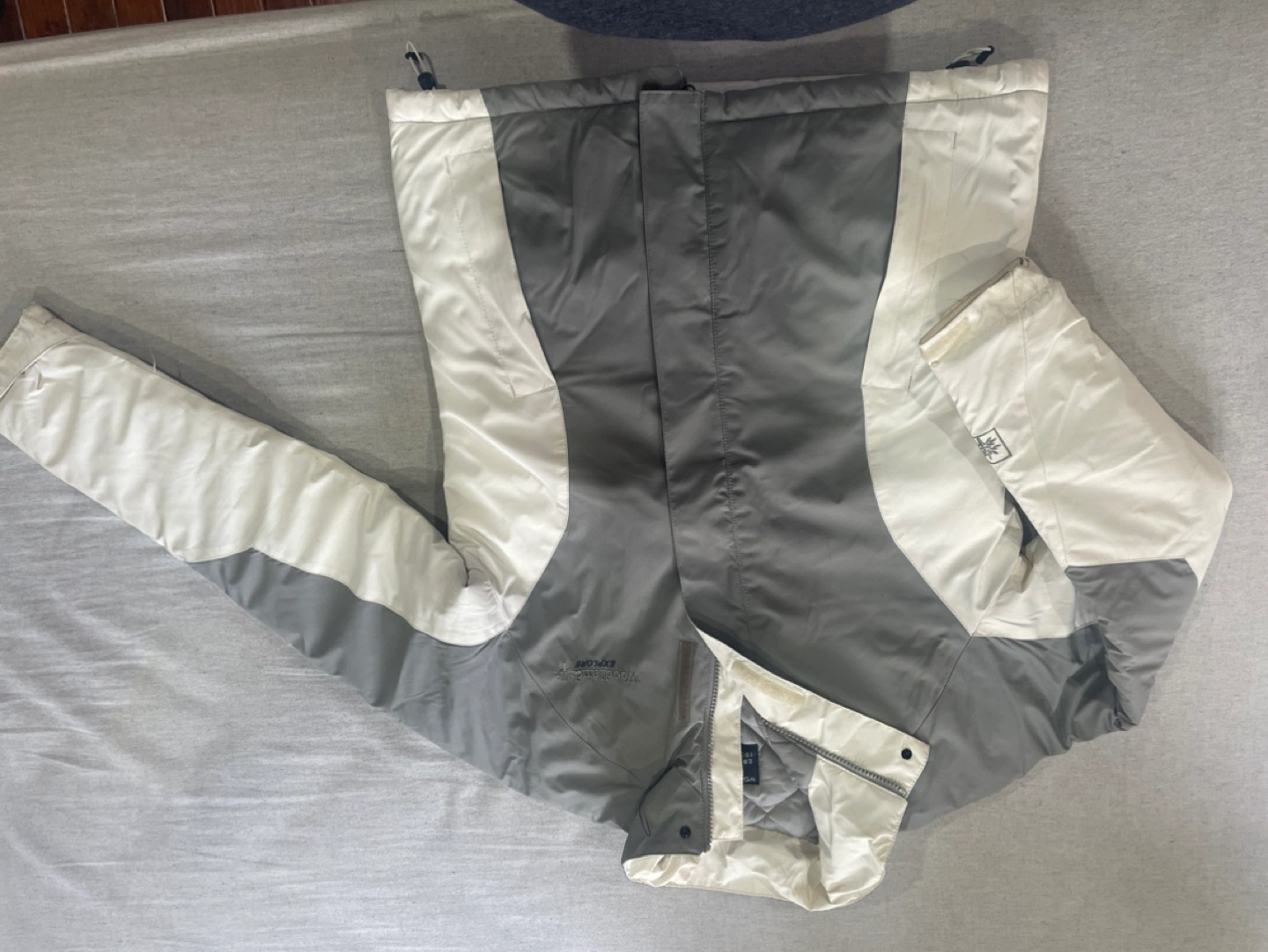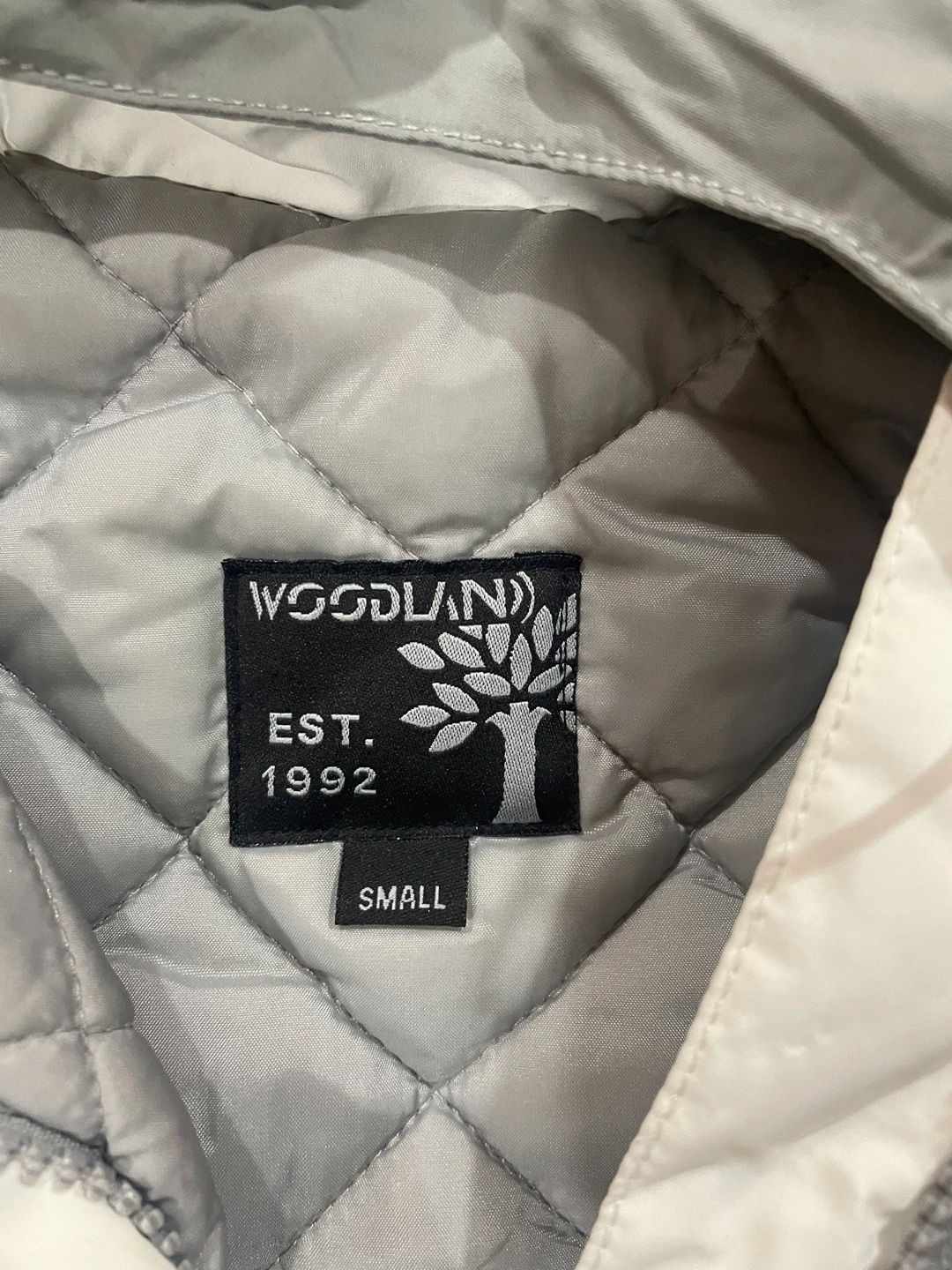 Grey and white ski jacket with a hood. Size small. Zipper and button closure. Clean and great quality. Very warm. Removable hood.