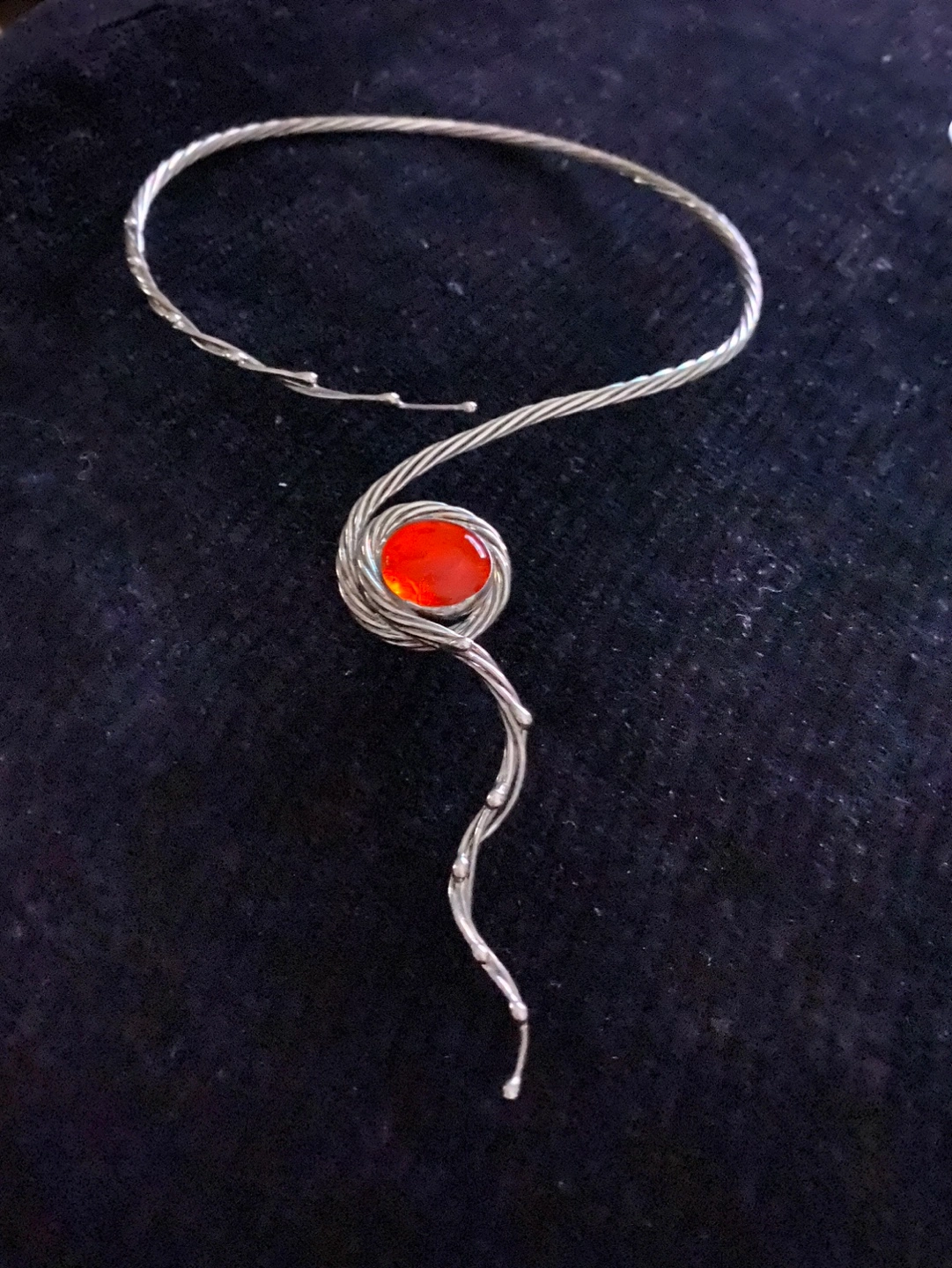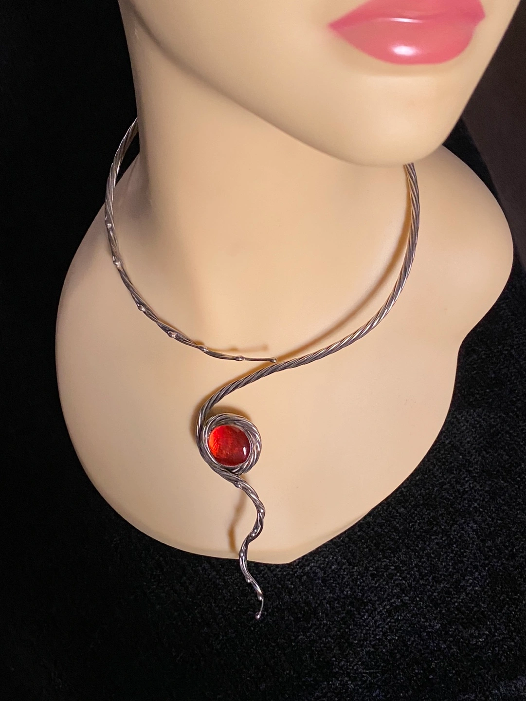 Silver tone statement necklace with a red stone. The necklace is a 7 strand twisted design.