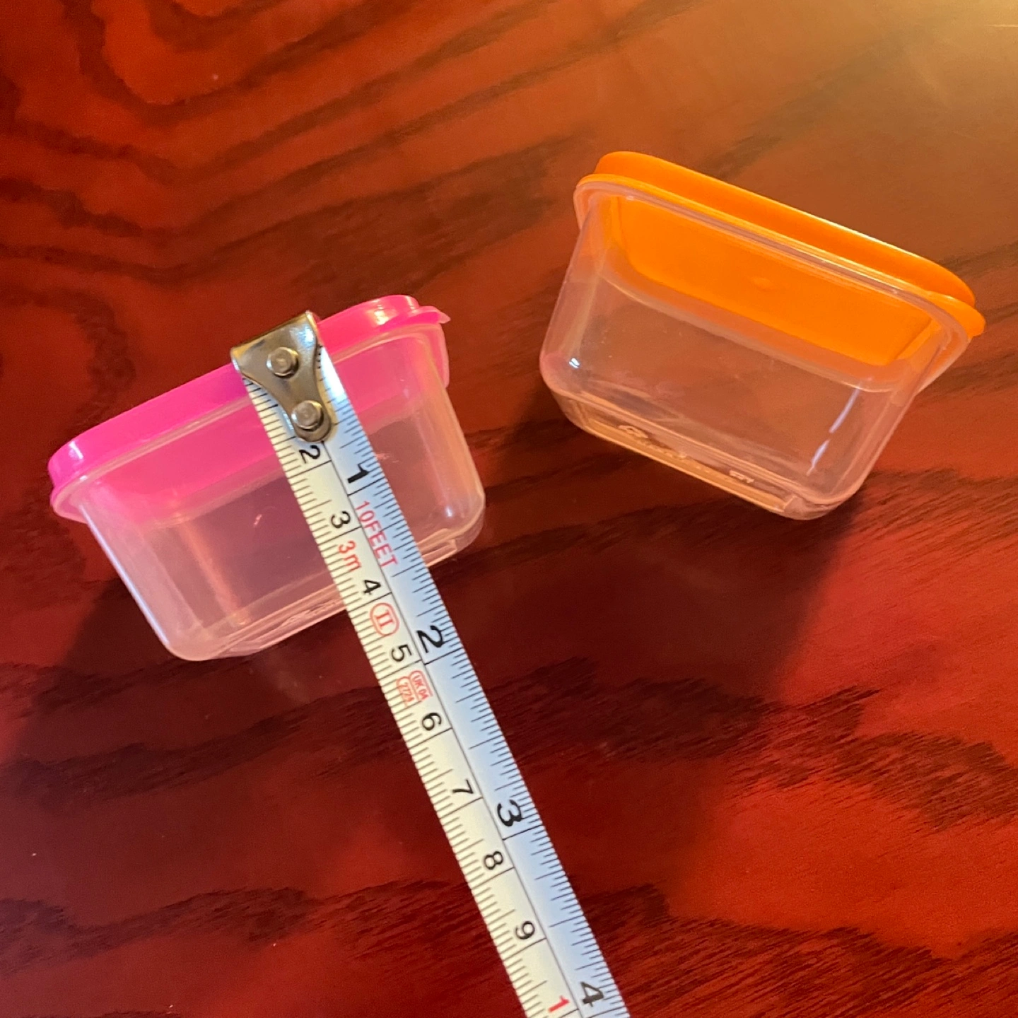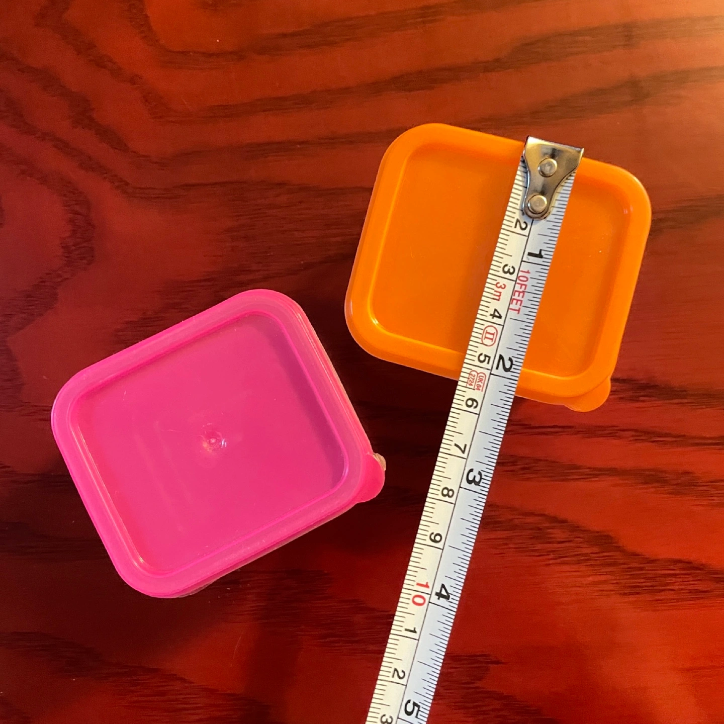 258Two small plastic containers with lids. One is pink and one is orange. They are clear plastic and can be used for snacks for kids to bring to school