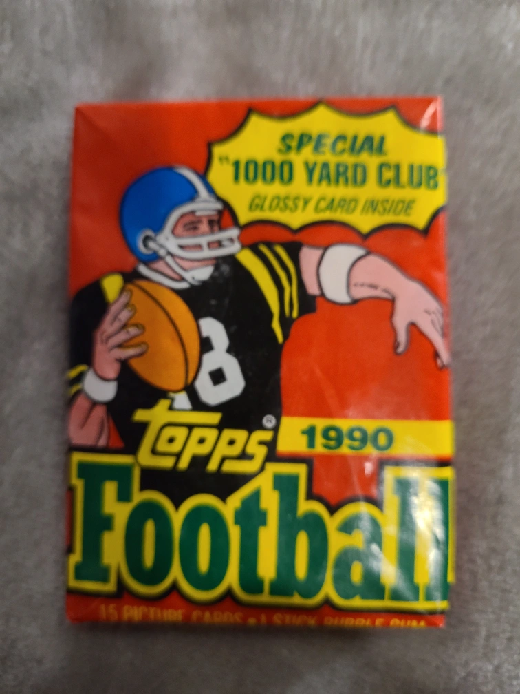 1990 Topps Football sealed packs. Contains 15 trading cards and 1 bubble gum. Features the '1000 Yard Club' glossy card. Multiple packs available.