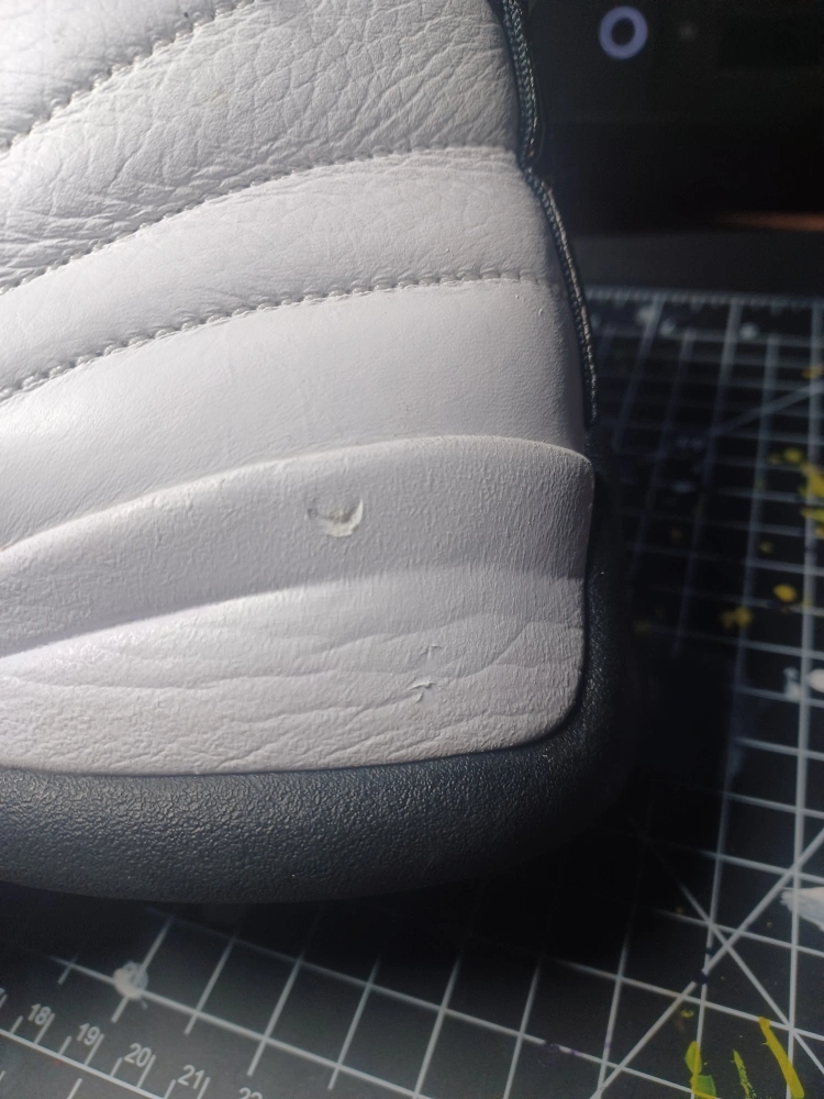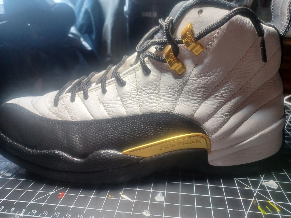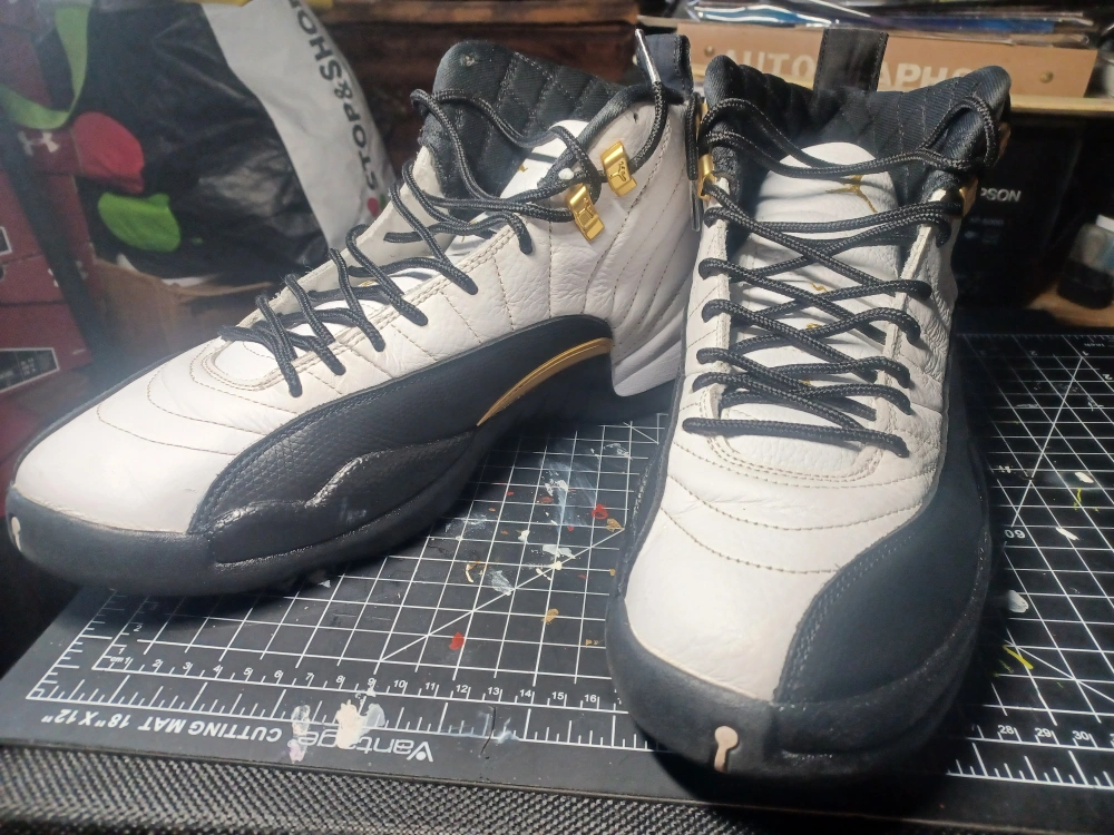 White, black, and gold colorway. Black laces. Some wear and tear. Small indentation in white leather on left shoe.