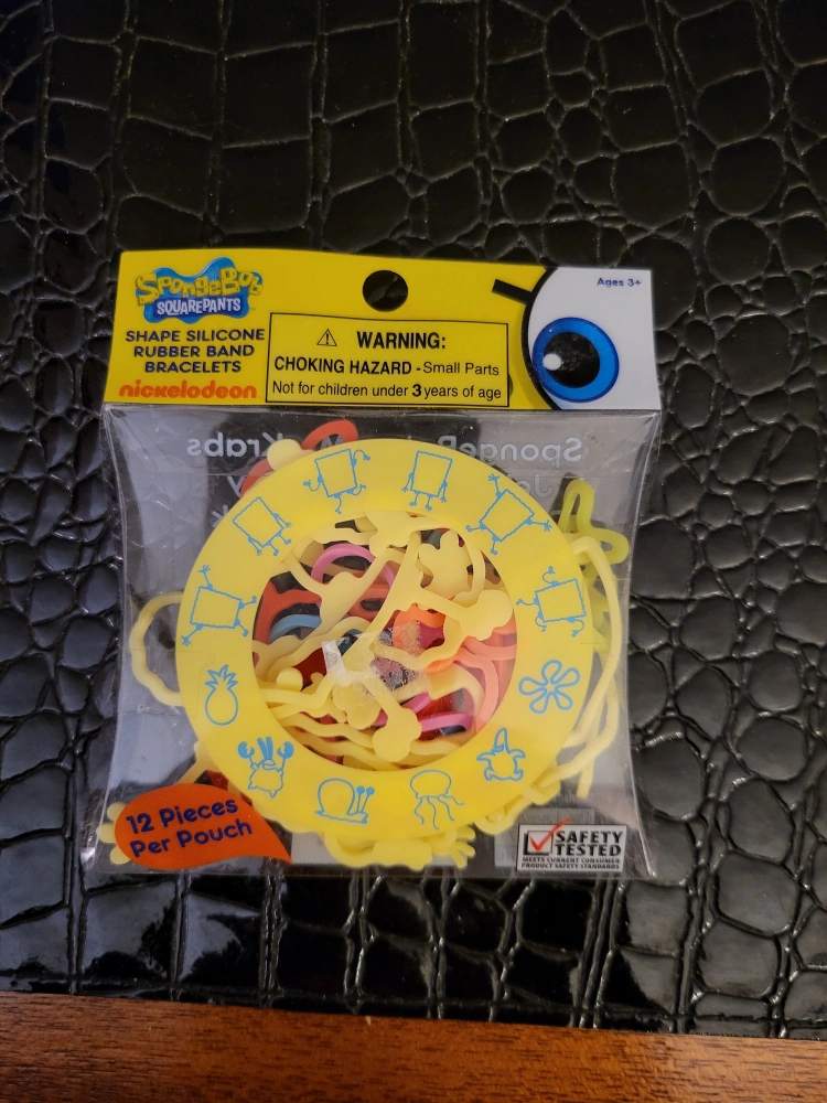 70Set of 12 SpongeBob Squarepants character rubber band bracelets per pkg. The price is for 2 pkgs of 12! Great fun for birthday parties too. All kids, boys and girls, will love these. They can make their own unique bracelet! All Sales Final, No Returns. Cash only please.