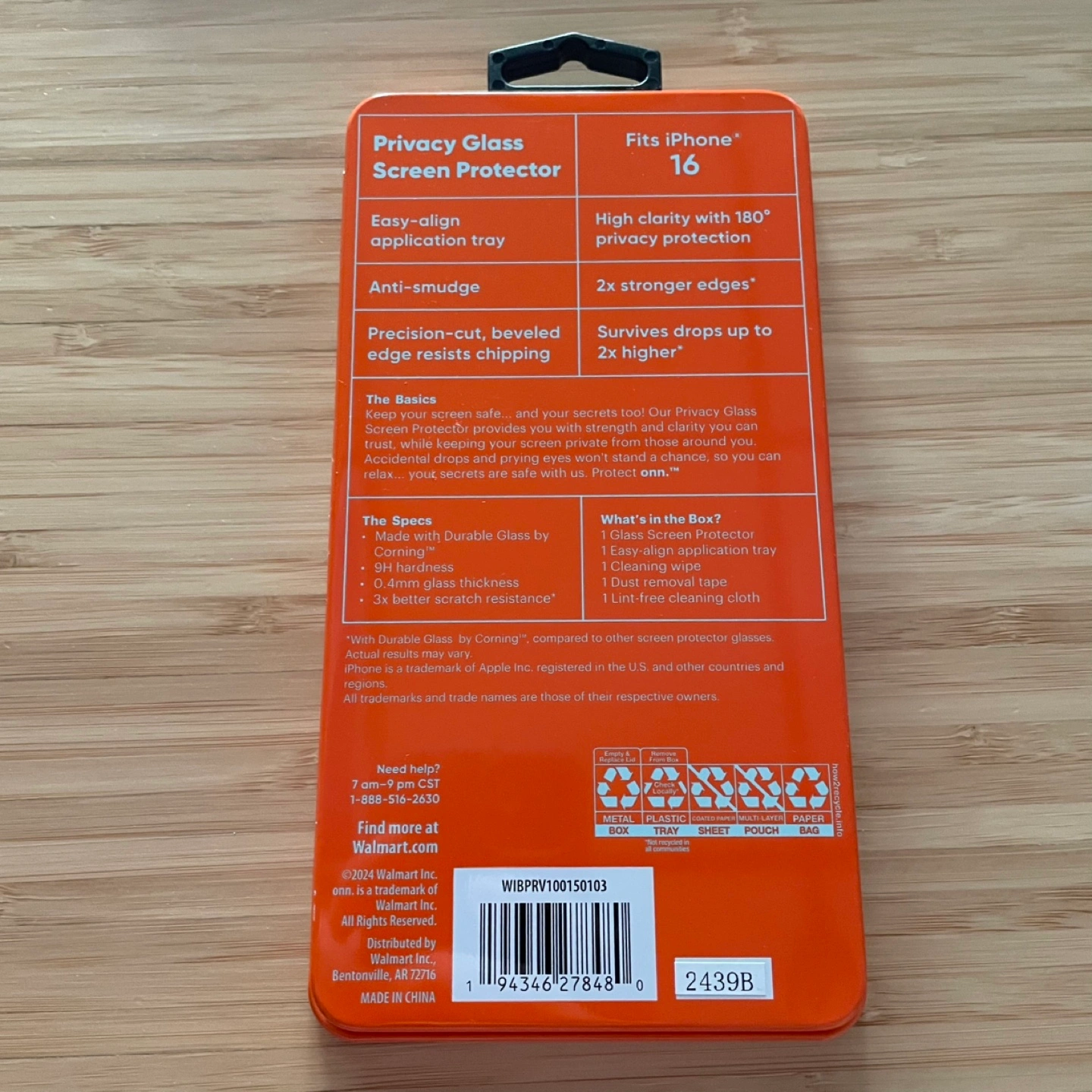 Brand new Privacy glass screen protector for iPhone 16. Made with durable Corning glass and with easy-align application tray. It features anti-smudge, precision-cut for front facing camera, and beveled edge that’s easier in your fingers.