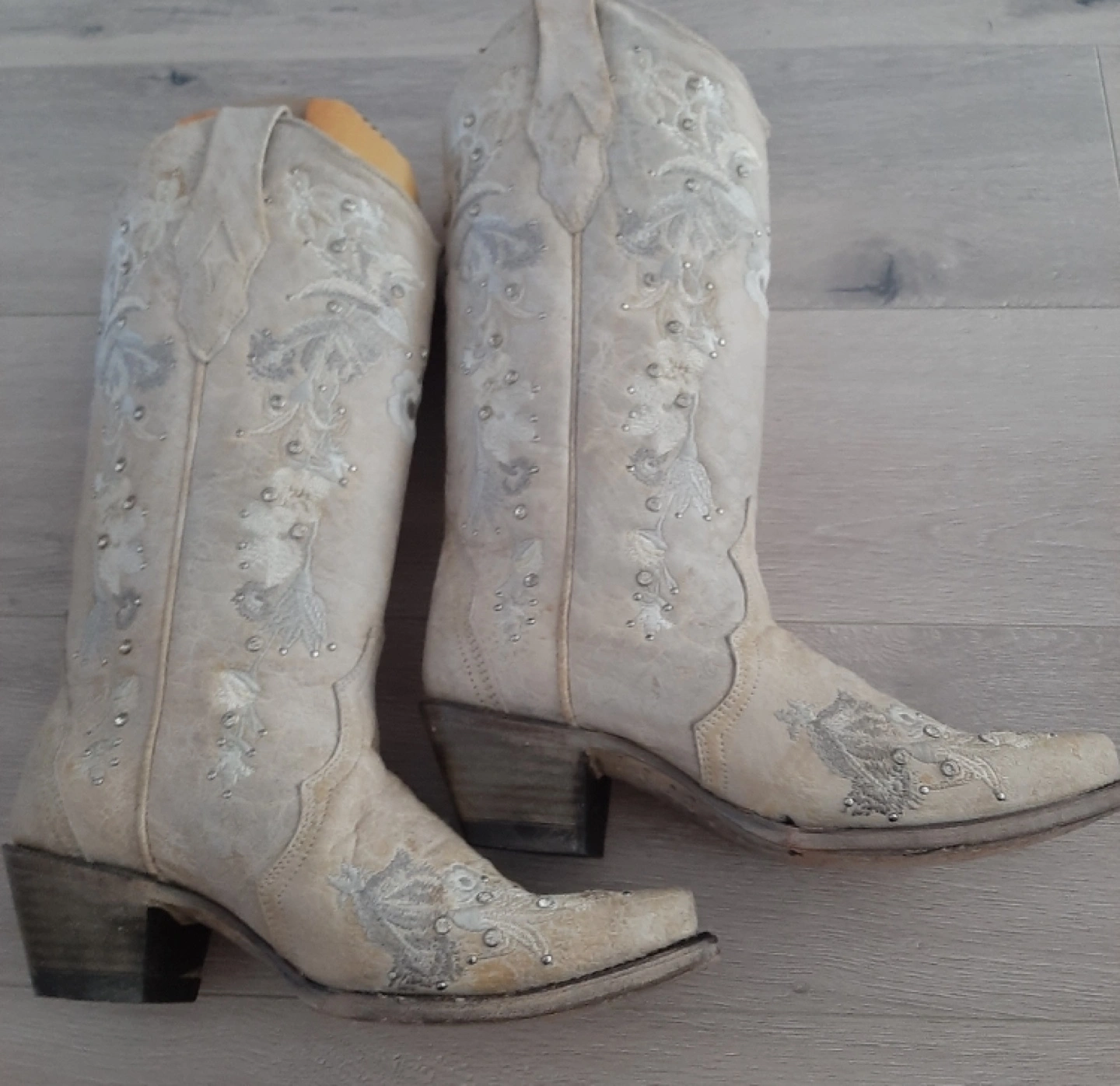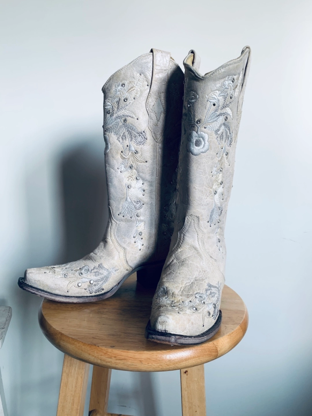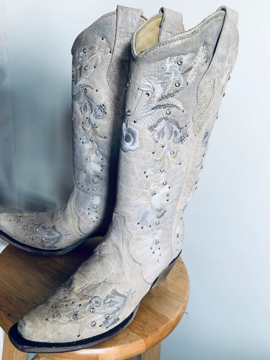 Unworn. Stunning white leather ‘Corral’ cowboy boots with floral embroidery and embedded crystals. True size 8.