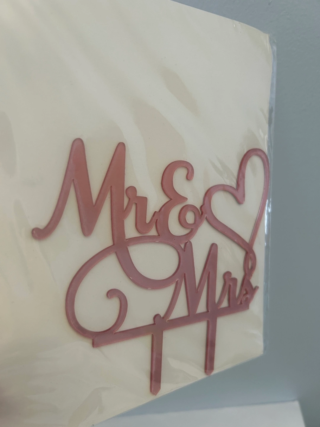 Rose gold cake topper with Mr & Mrs and a heart. Perfect for a wedding cake.
