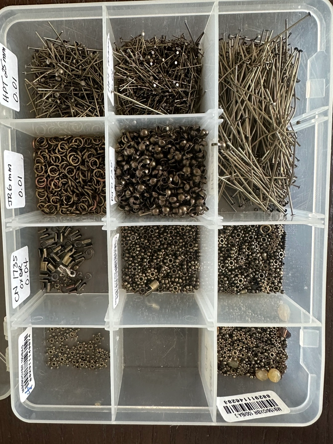 Assortment of jewelry making supplies, including head pins, jump rings, crimp beads, and bead tips. All items are in a clear plastic container with multiple compartments.