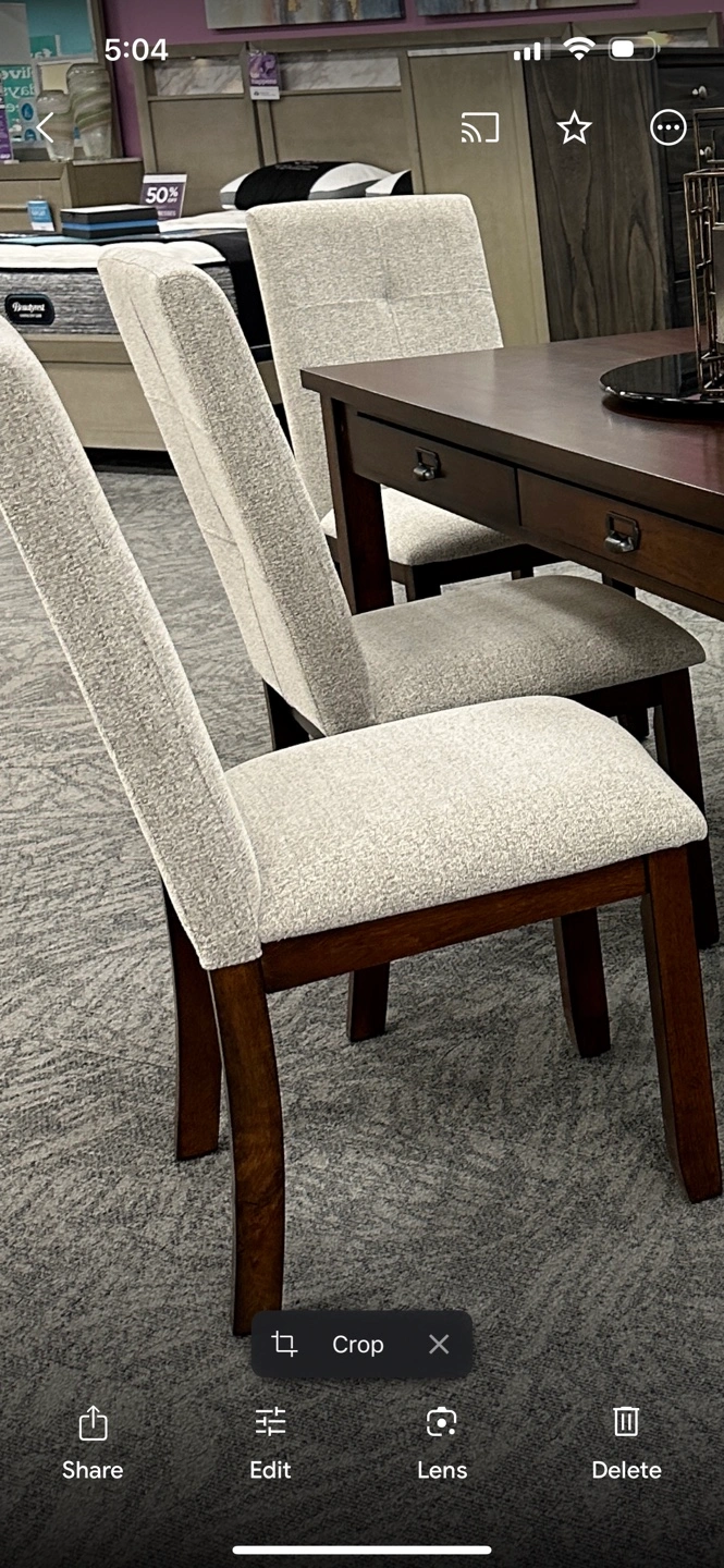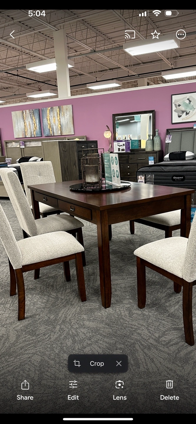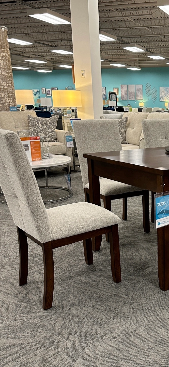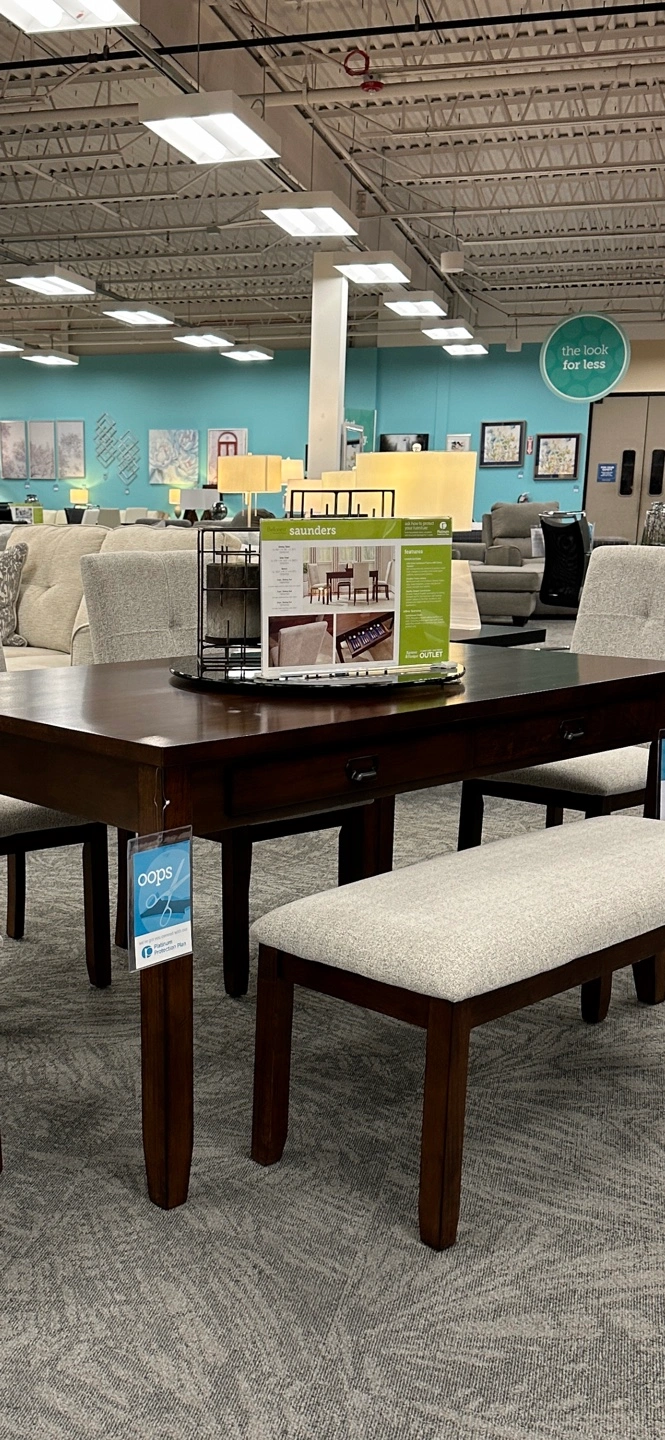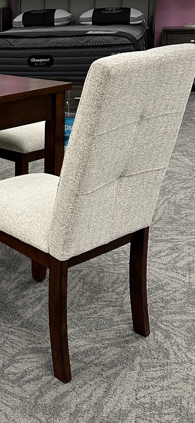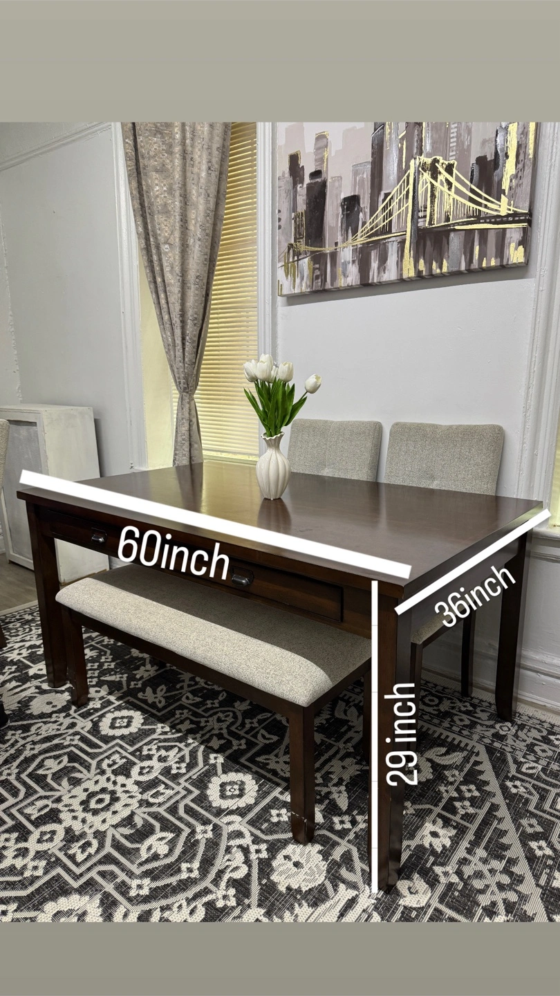 Table with two drawers each side and 3 chairs. & 1 long sit bench have a light grey fabric seat and a dark brown wooden frame.