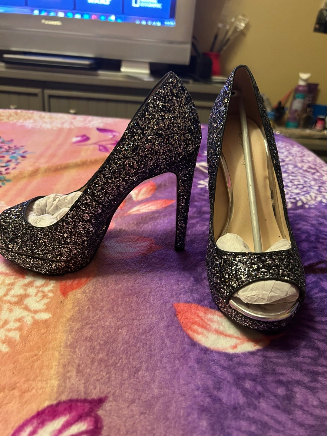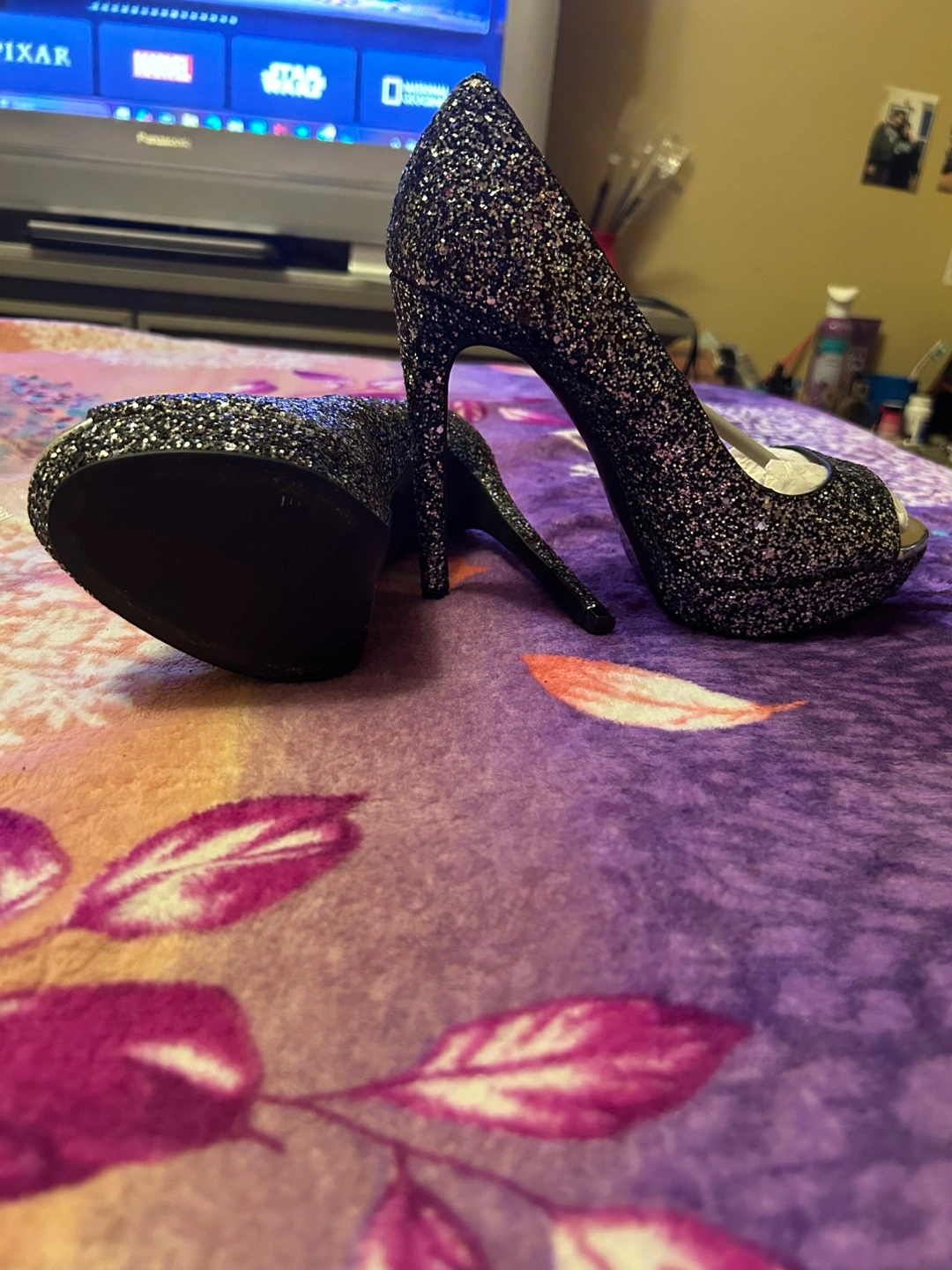 65Black glitter platform heels with an open toe. They have a high heel and a platform. They are in good condition.