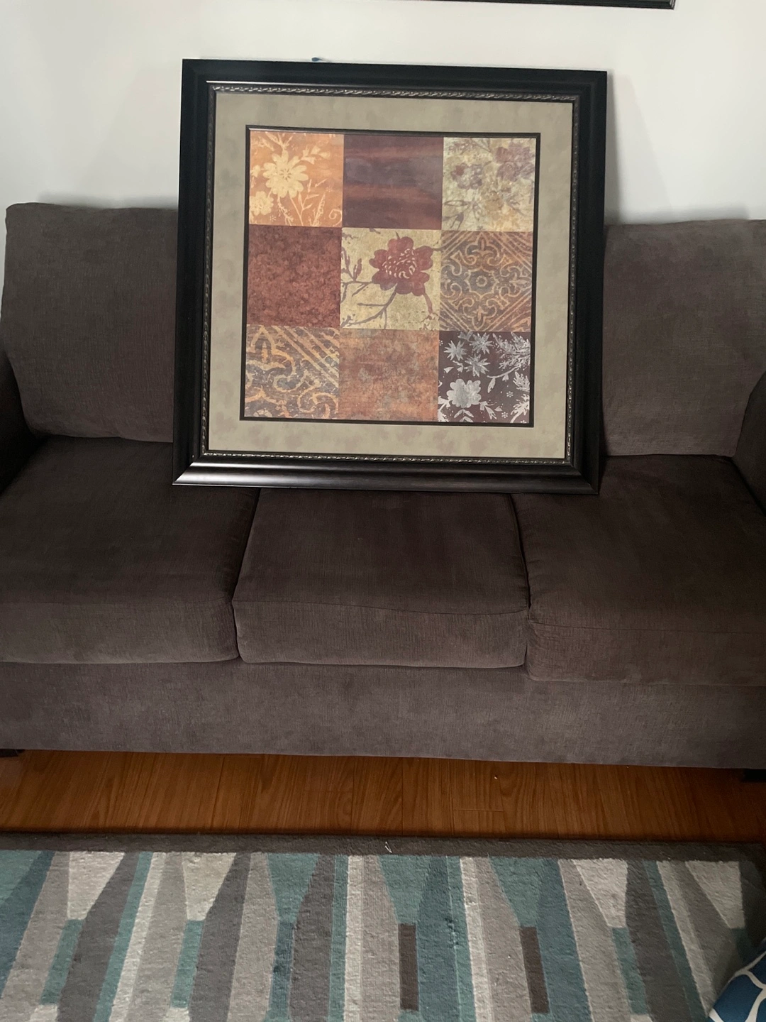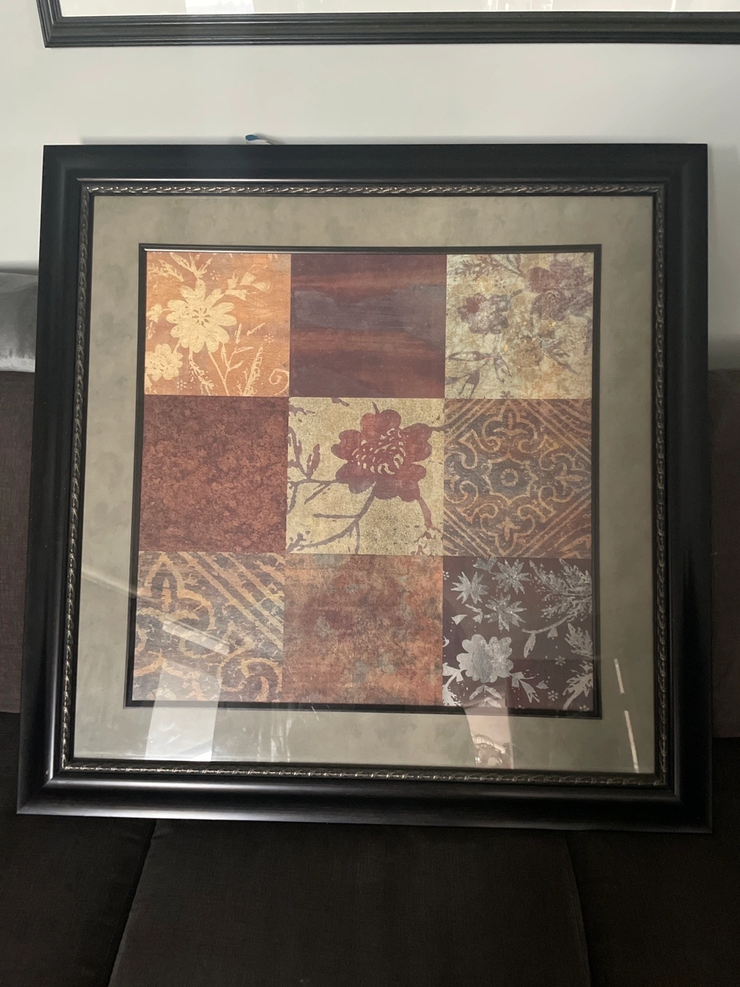 Framed wall art with nine squares of various patterns. Has a dark brown frame. Comes with a hanging wire