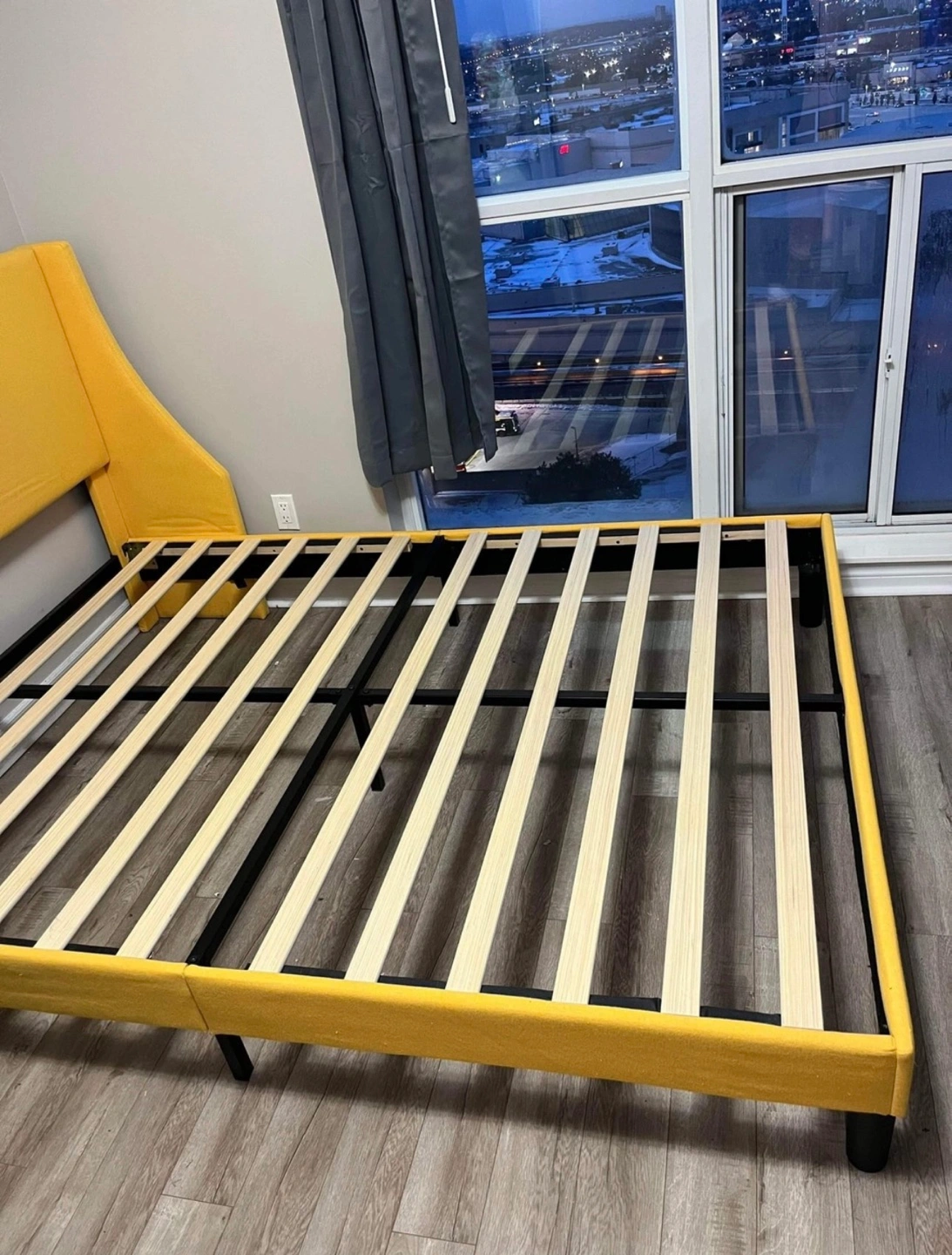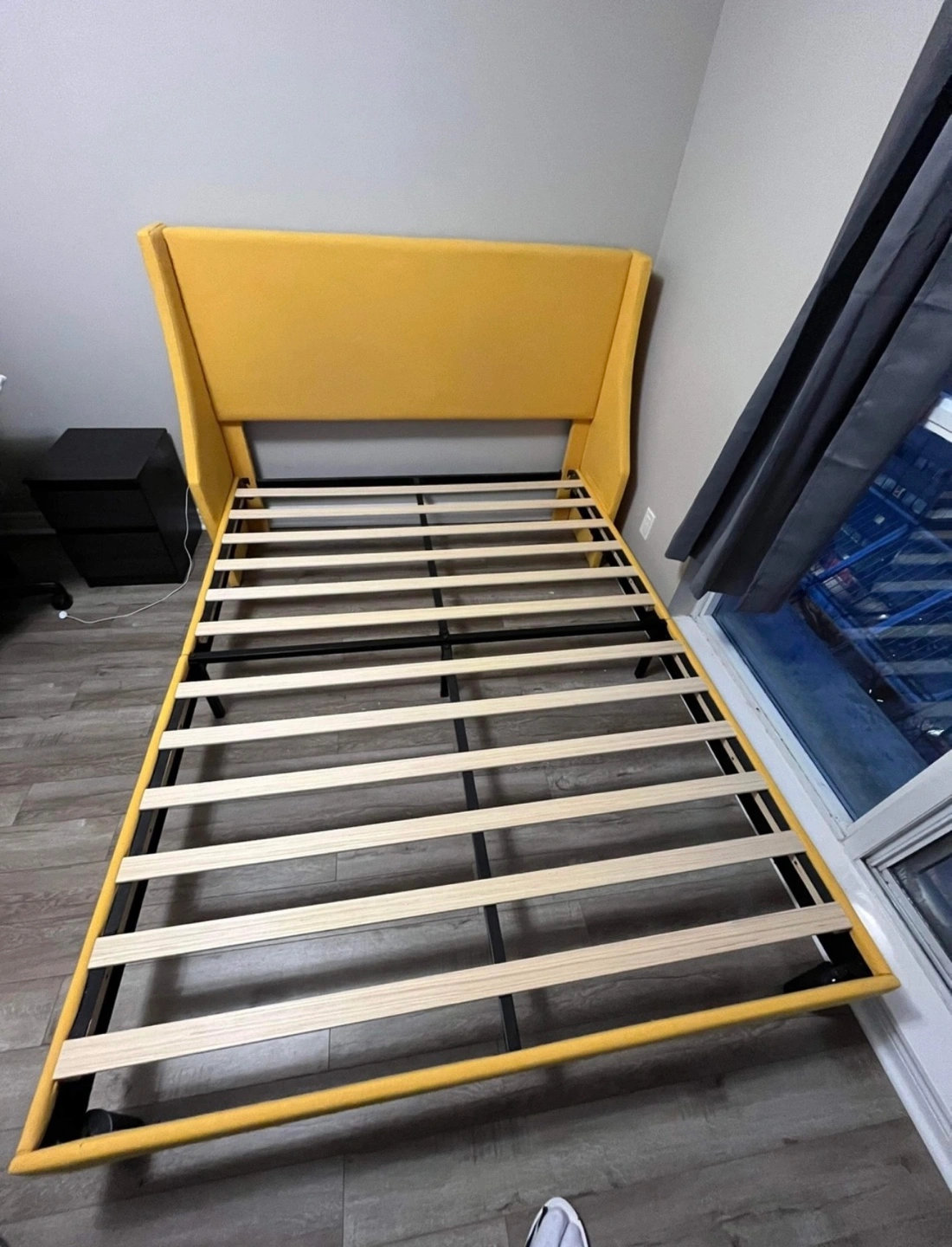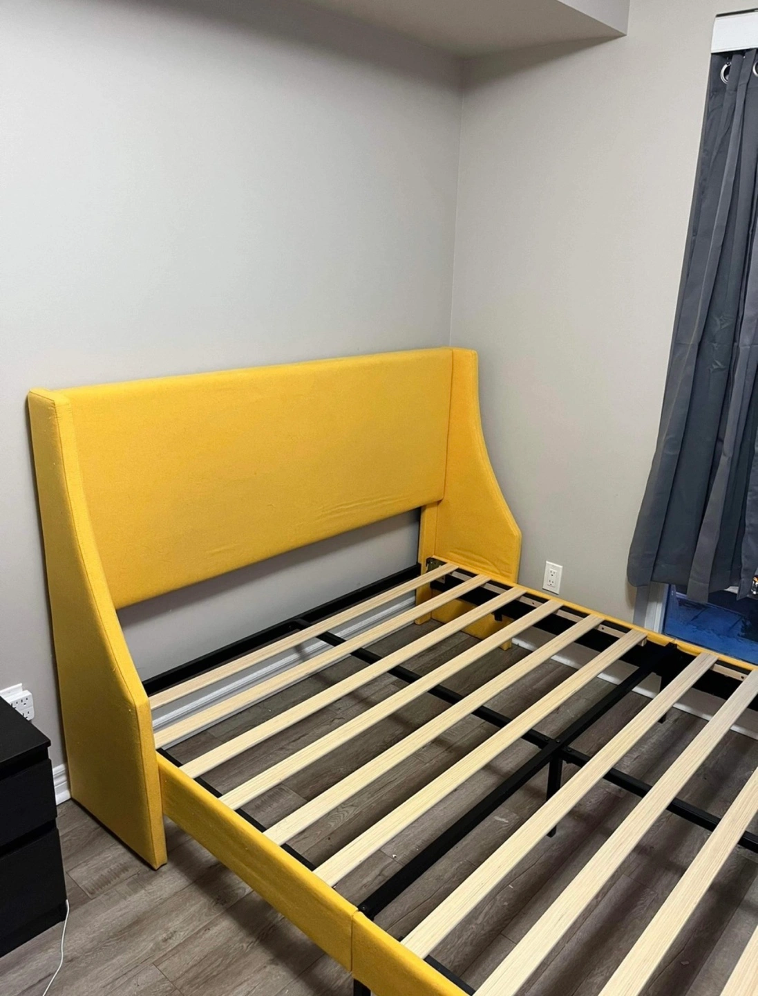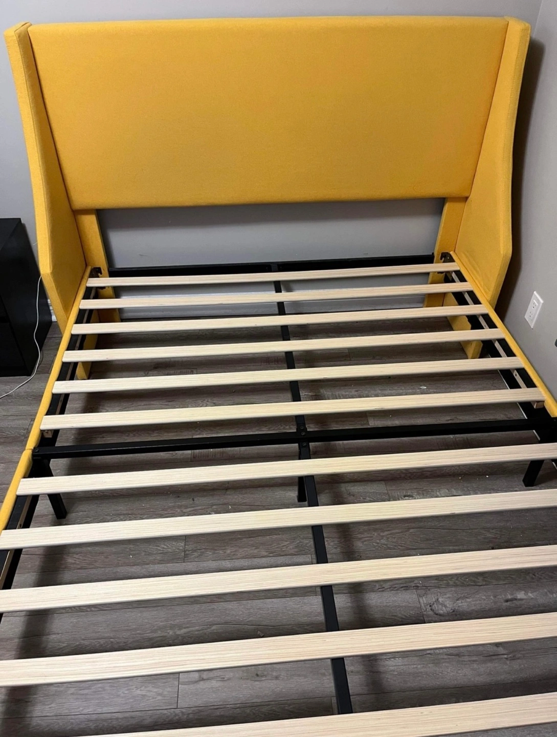 Queen size upholstered bed frame with headboard. Includes slats for mattress support.