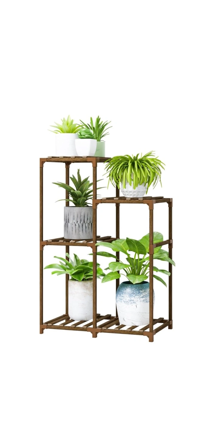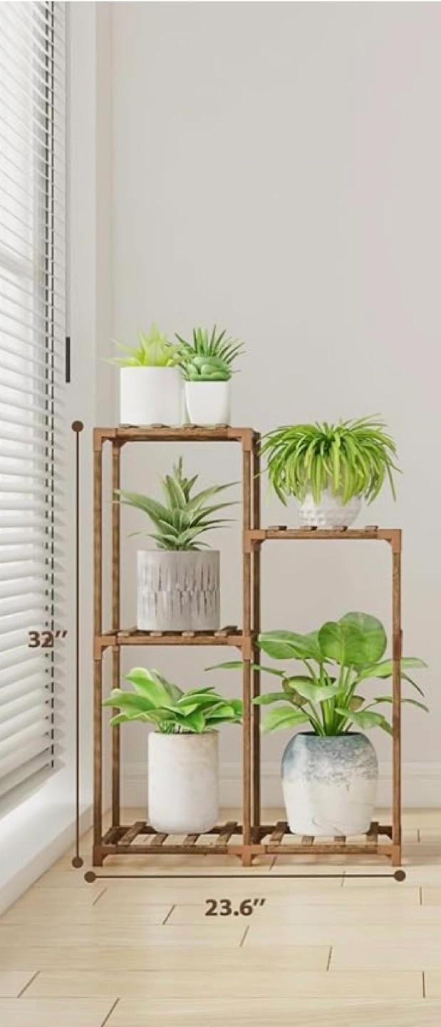 Four-tiered plant stand. 32 inches tall and 23.6 inches wide. Made of wood. Includes 4 shelves.