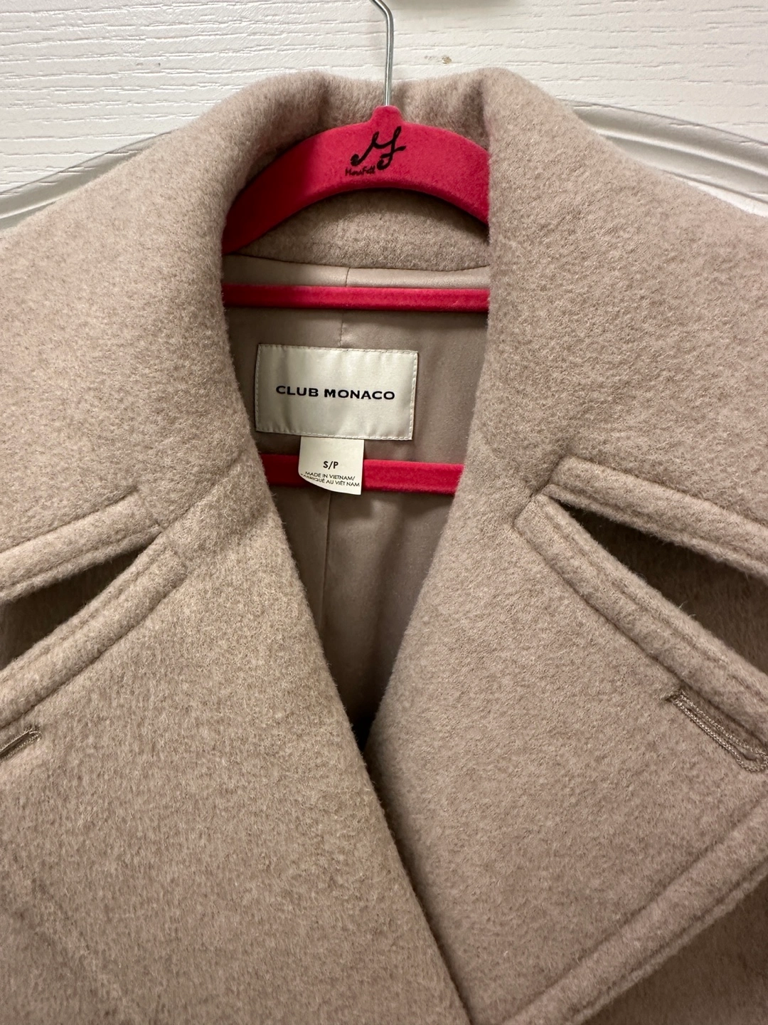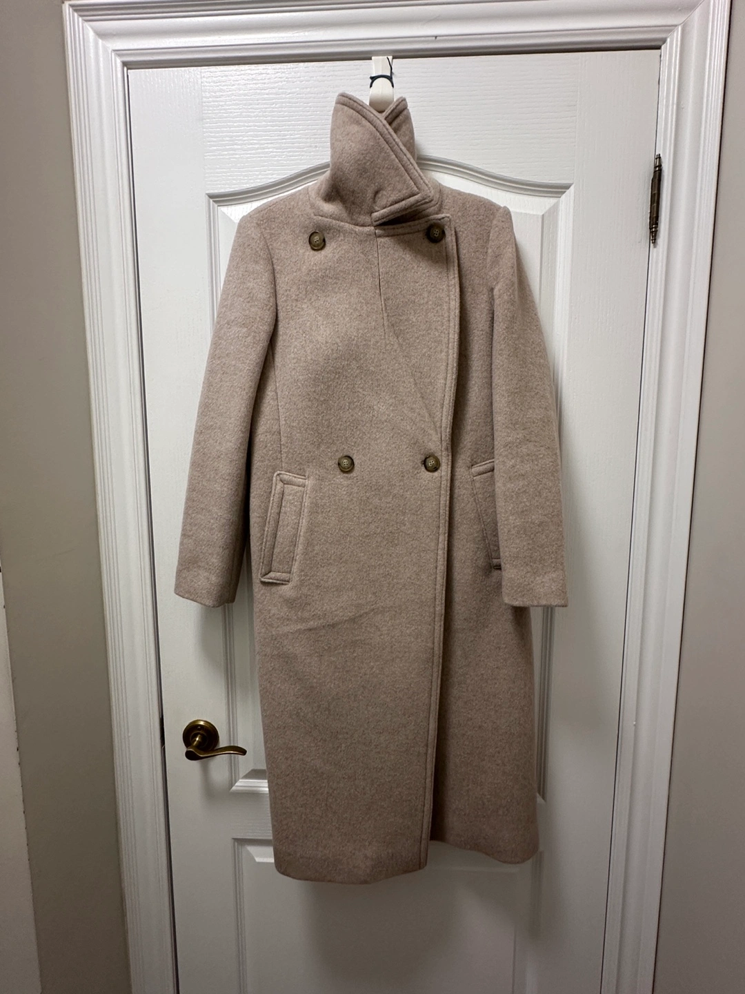 Long, beige wool coat with a double-breasted closure. Features two pockets and a high collar.