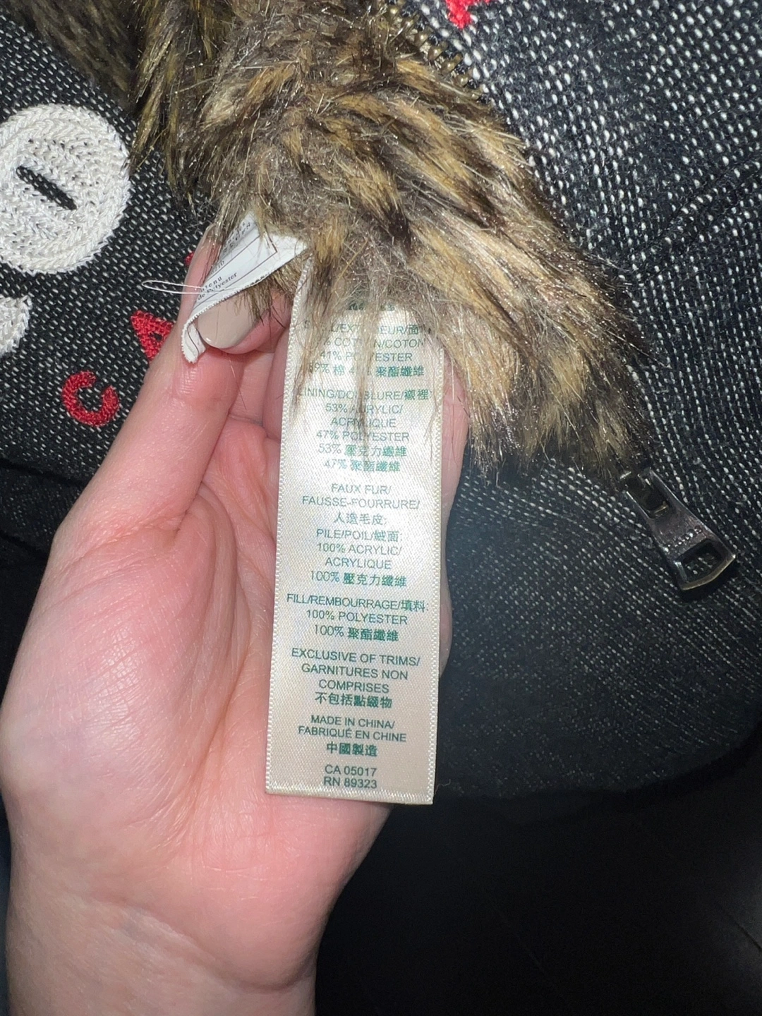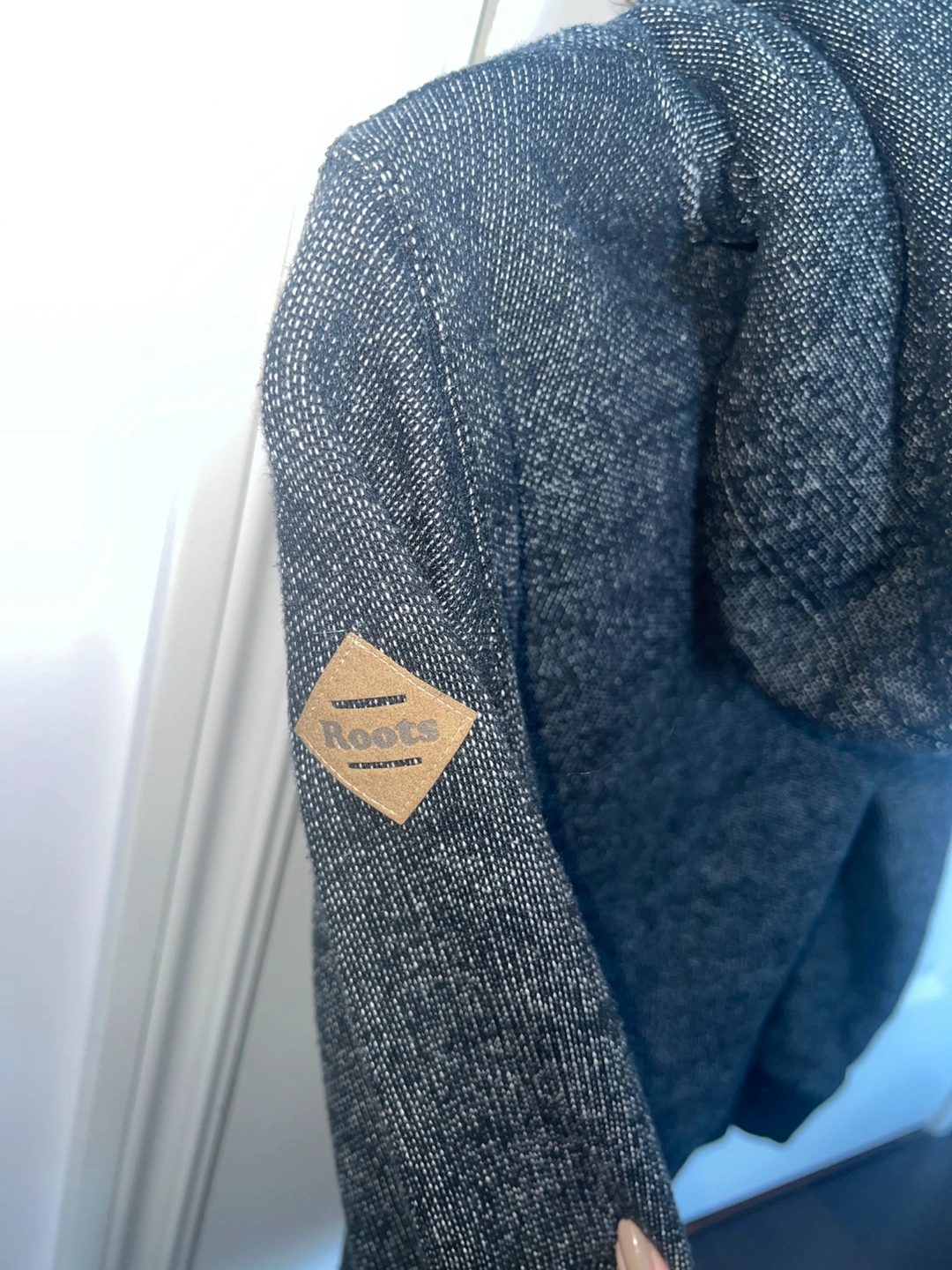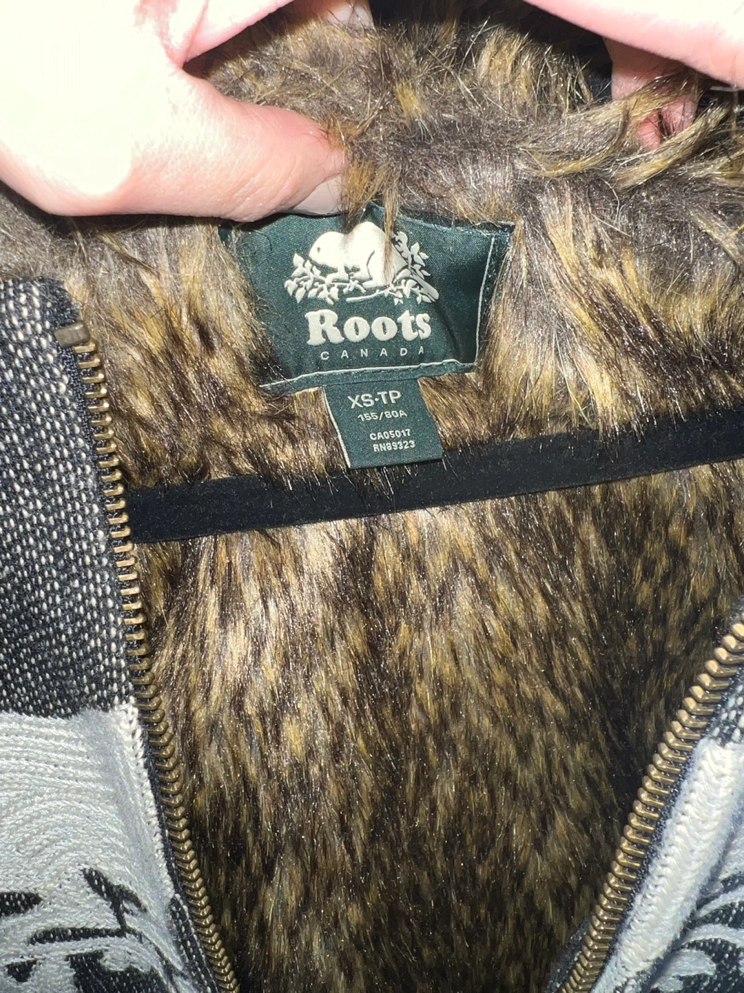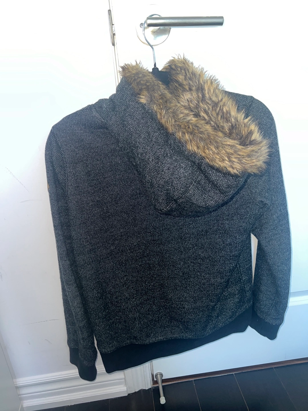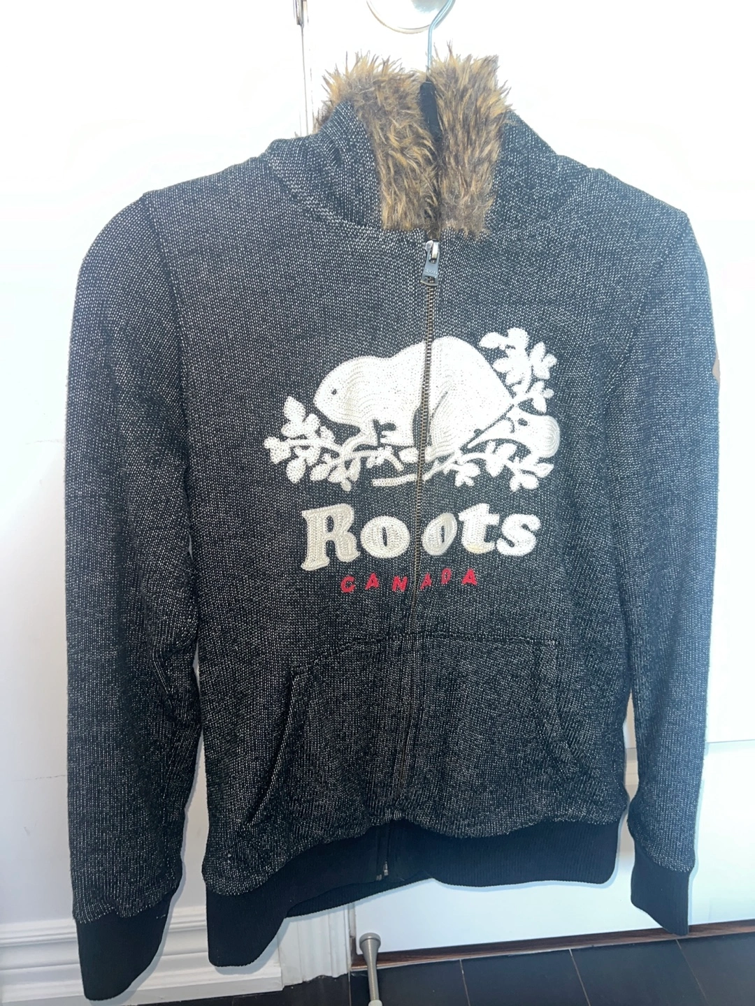 Black and grey hoodie with faux fur trim on the hood. Zip up front and Roots logo on the front.
