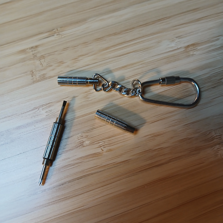 Multi-tool keychain screwdriver set. Includes interchangeable screwdriver bits. Great for repair eyeglass on the go.