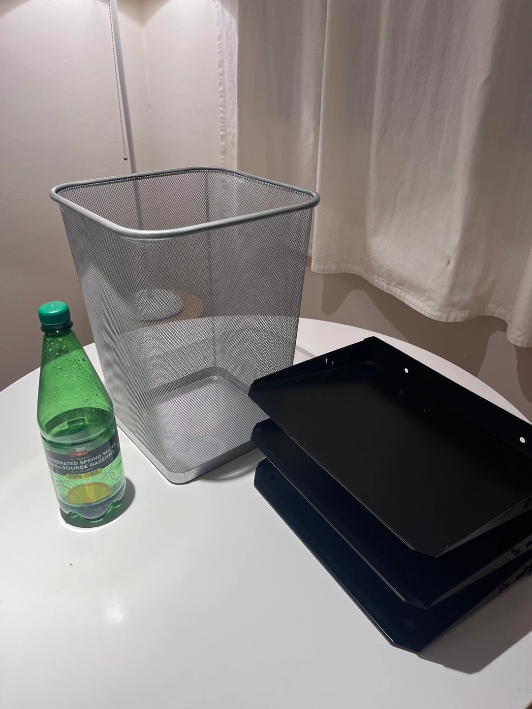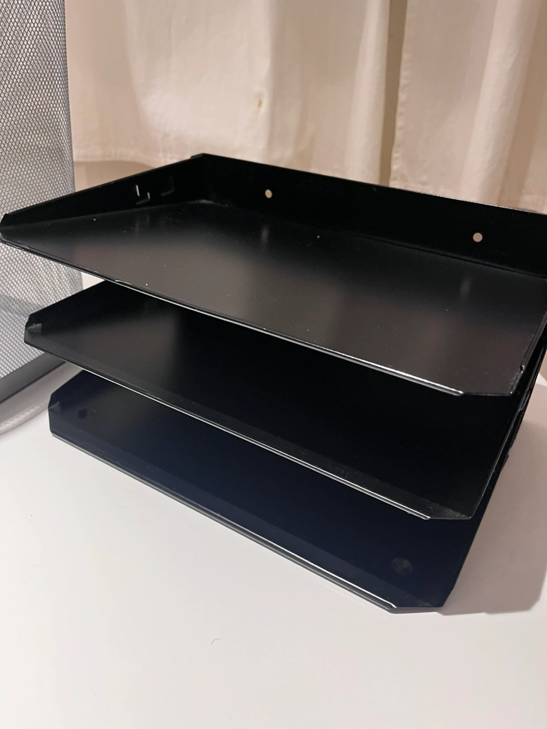Three-tiered letter tray A4 doc. and a wire trash bin. Both made of metal.