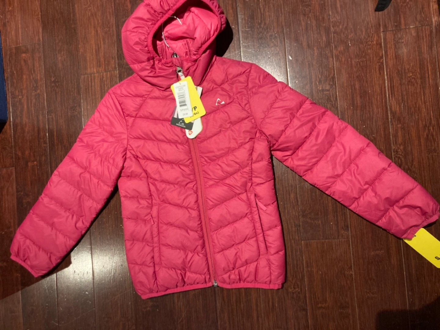 Pink puffer jacket with a hood. Size S/P (6/6X). New with tags.