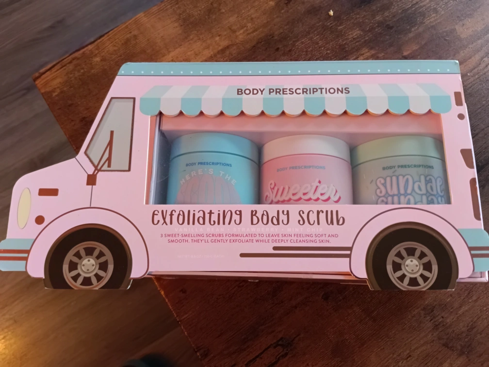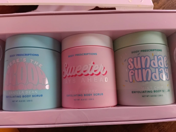 Set of 3 body scrubs: Vanilla Bean, Strawberry, and Mint Chip.