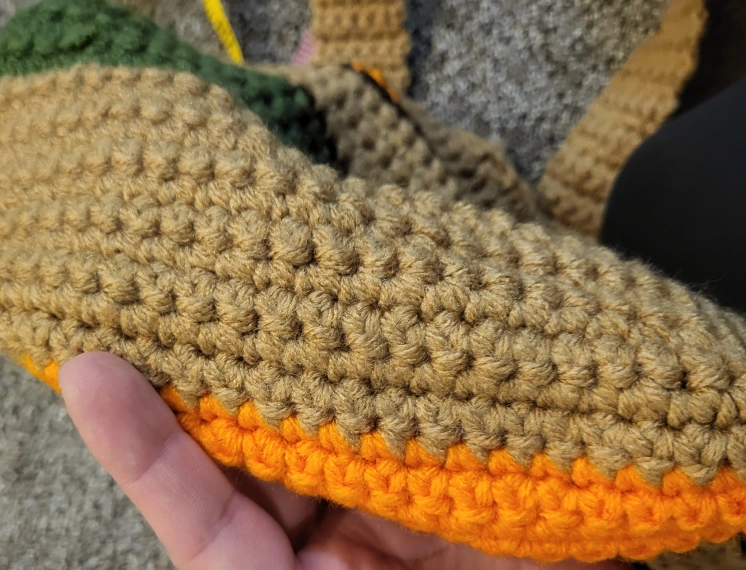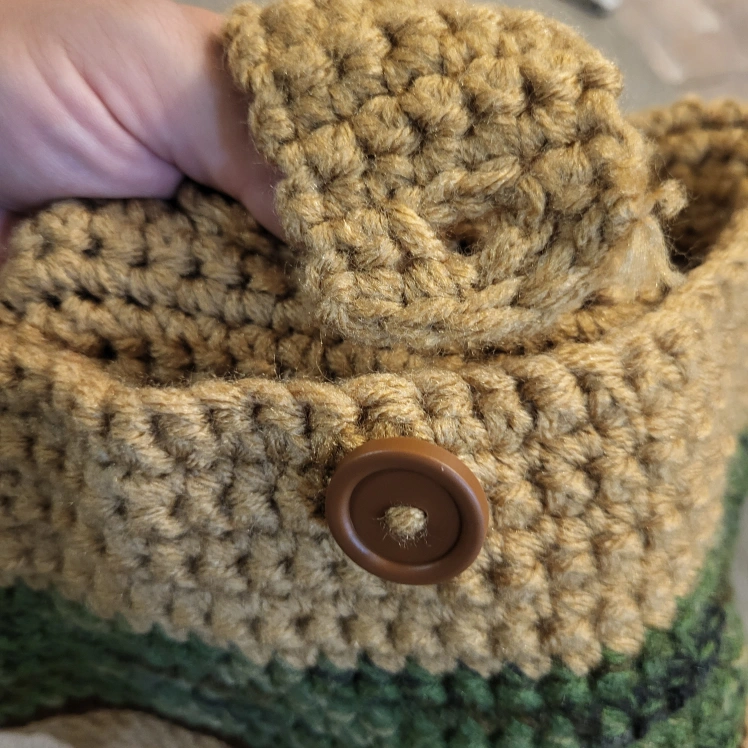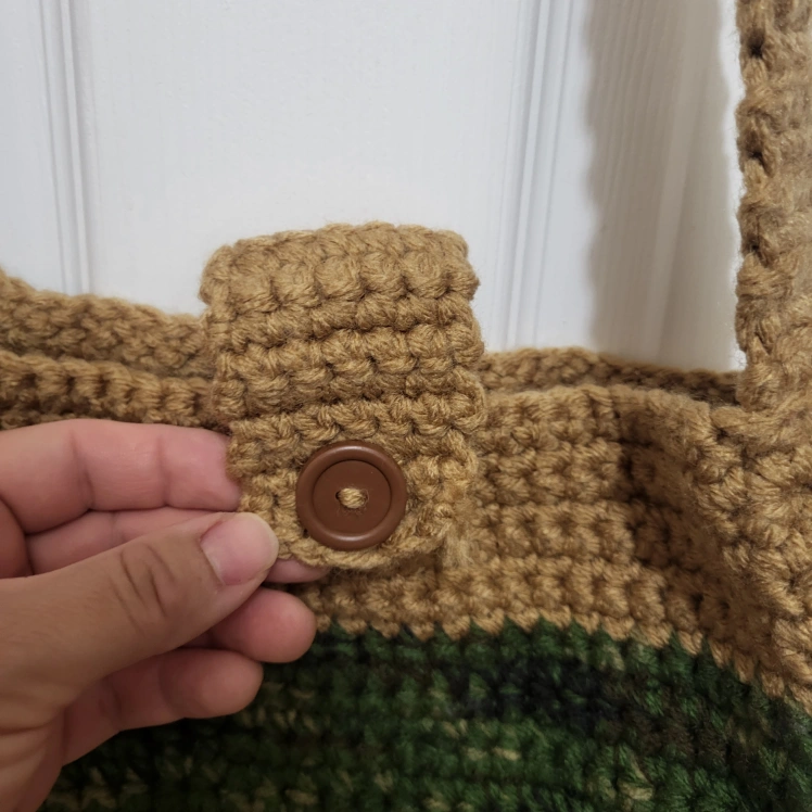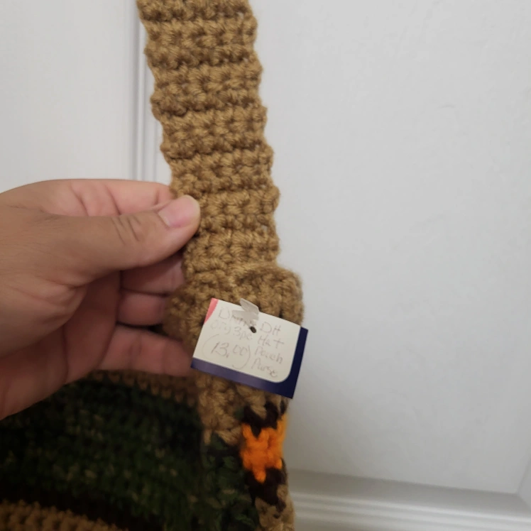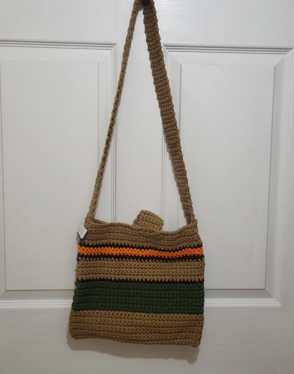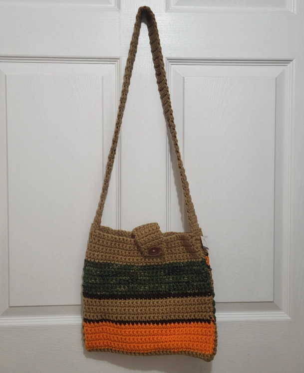 This handmade crochet knit crossbody bag is the perfect accessory for any casual occasion. The bag features a square shape with a button closure and a brown crossbody strap that adds a touch of bohemian style to your outfit. The multicolor striped pattern in orange, brown, dark green and crochet accents give the bag a unique and colorful vibe that is sure to turn heads.