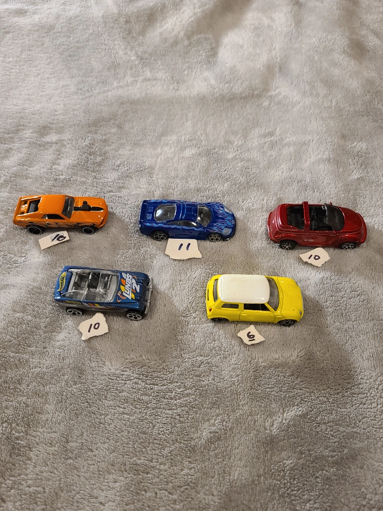 Five Hot Wheels cars in different colours and styles. Orange Mustang is missing rear window.