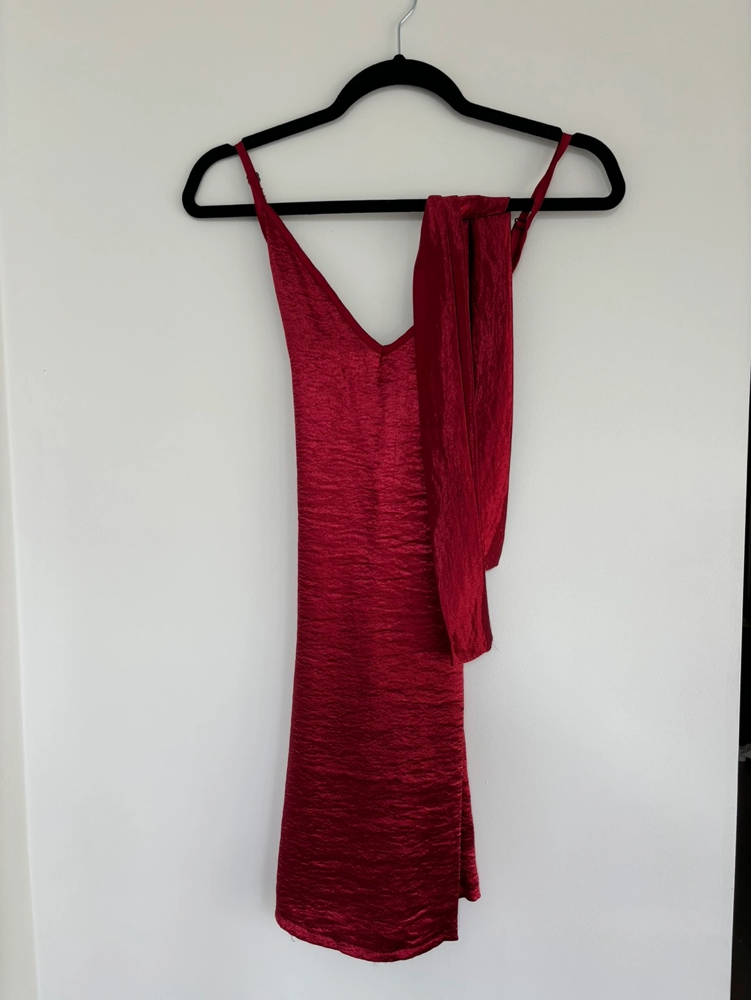 Red satin mini dress with spaghetti strap, cross-back and a tie detail. Great for a night out.