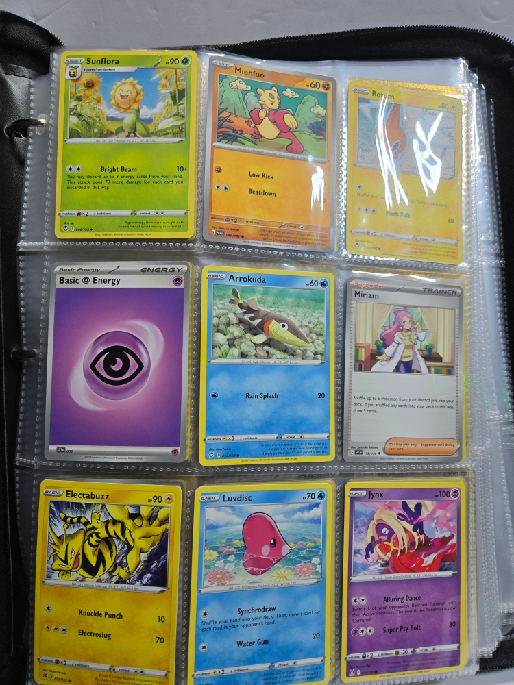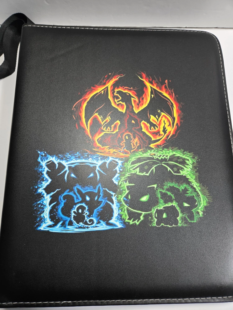 Pokemon Trading Card Game binder with cards. Binder has a black cover with a design of three Pokemon.