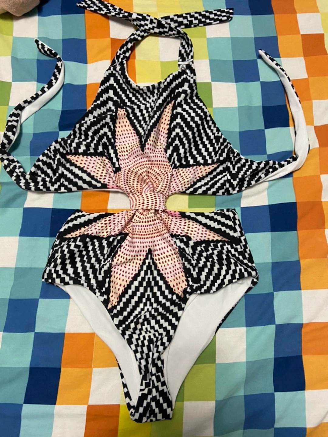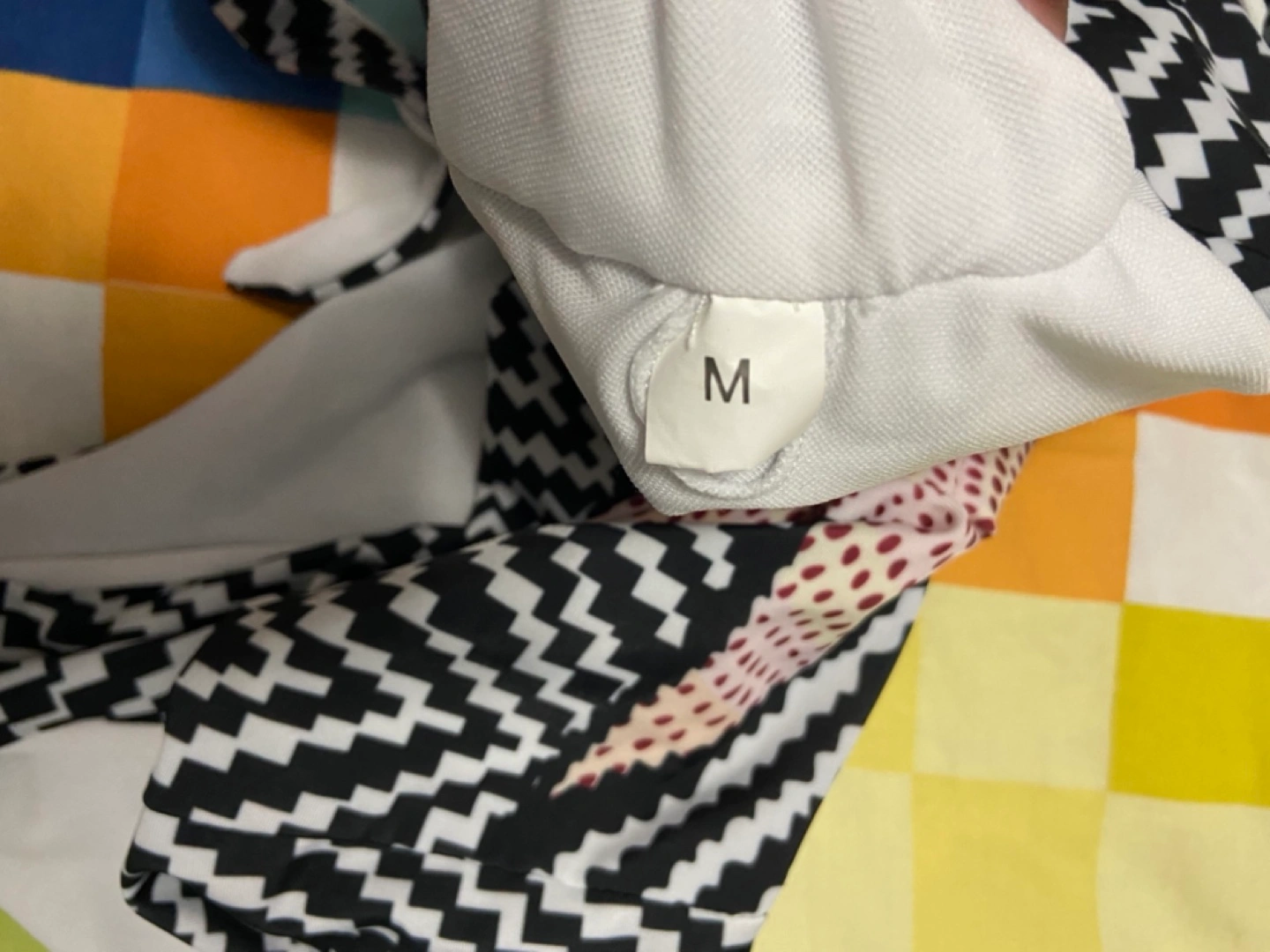 $15 each. Four swimsuits in various styles and colours. All are size M. One piece swimsuit has a geometric design, one piece swimsuit has a cutout, a bikini set with pink, red, and yellow colours and a floral print two-piece swimsuit with shorts. Used once. Only available for pick up.