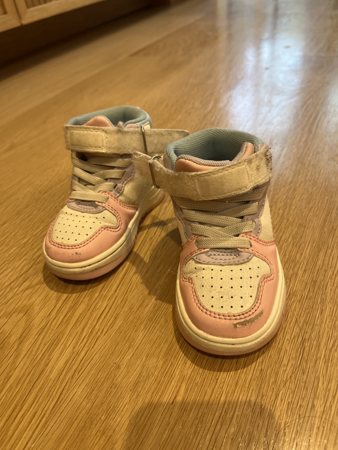 FREE Pink, white, and blue high top sneakers with velcro closures. Slightly scuffed but still has a lot of life left.