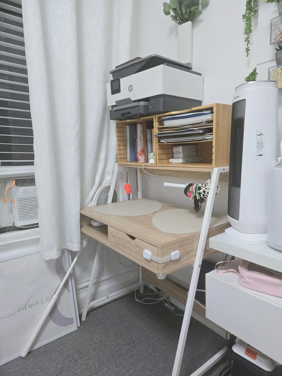 desk with a drawer and a small shelf. White metal legs. My husband bought for me and i realized that I my kids never let me sit there so I gave the chair away and need this to go.