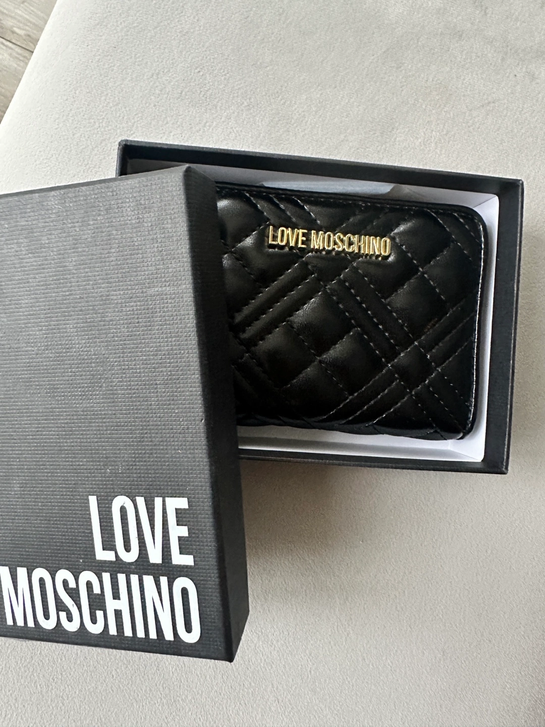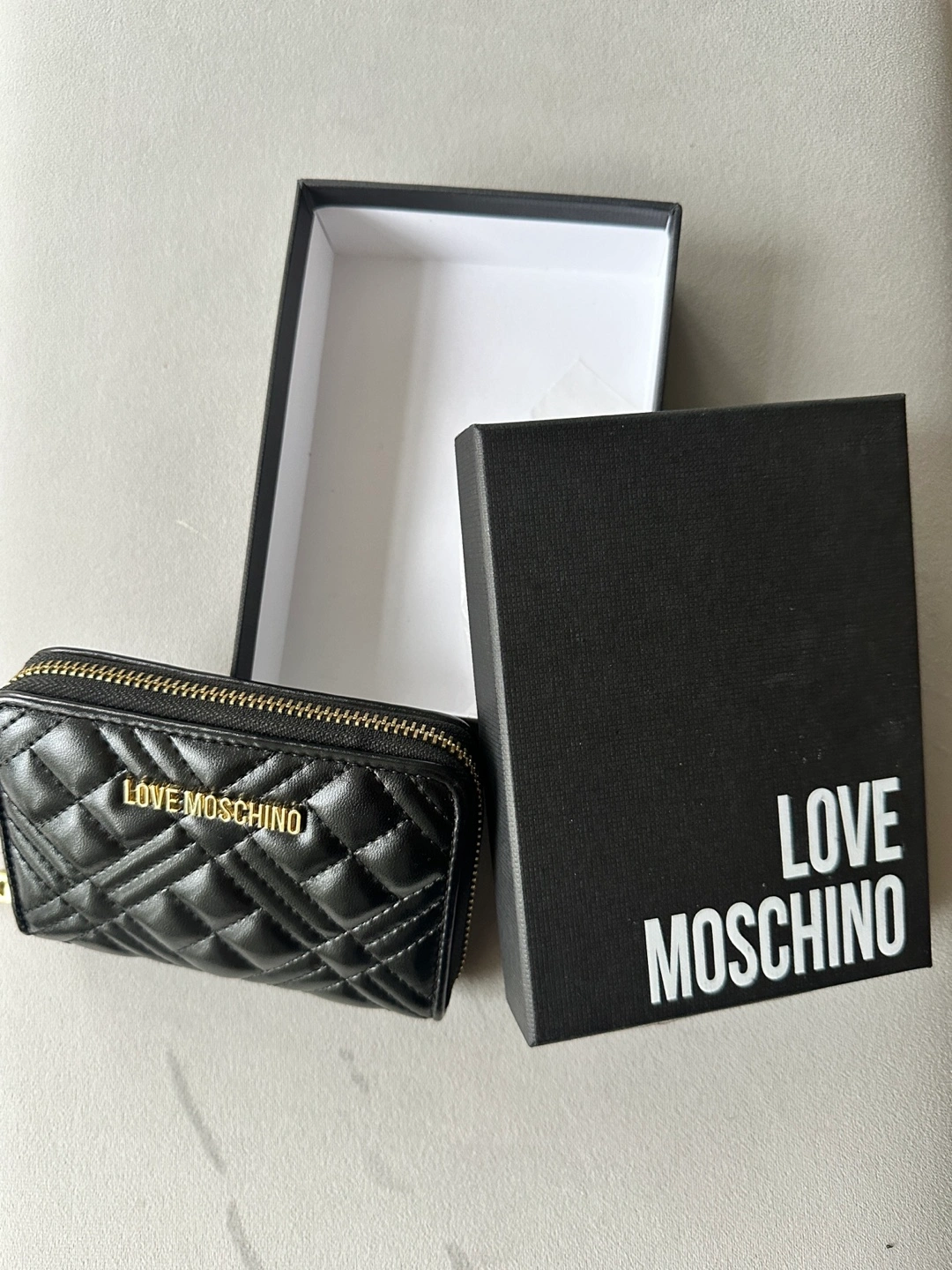 Black quilted zip around wallet. Comes with box.