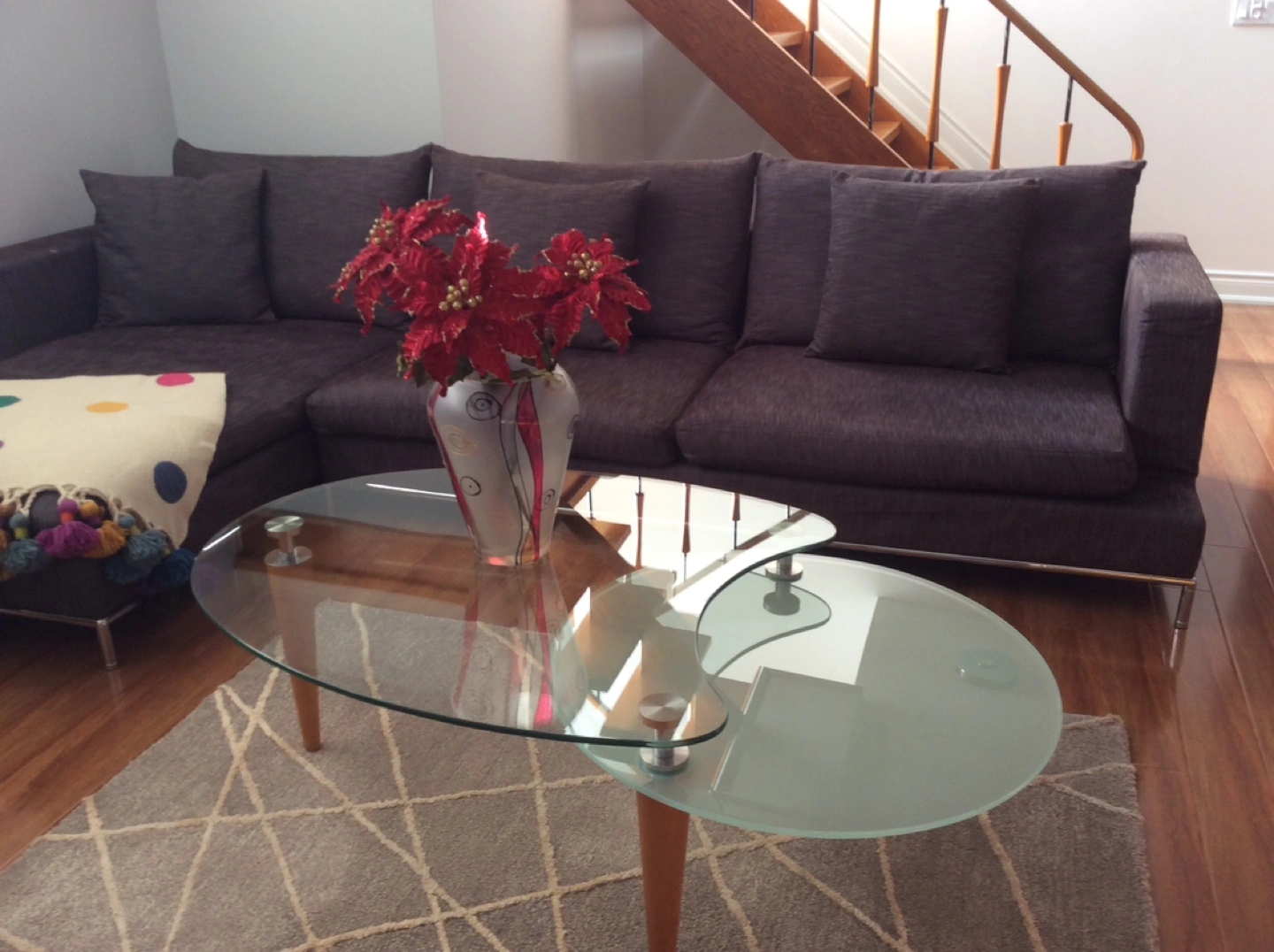 Unique glass coffee table with a modern design. Features a clear glass top with a frosted center and teak legs. Will enhance your living room! 51” long x 31” wide. 17 1/2” tallest and 14 1/2” shortest.