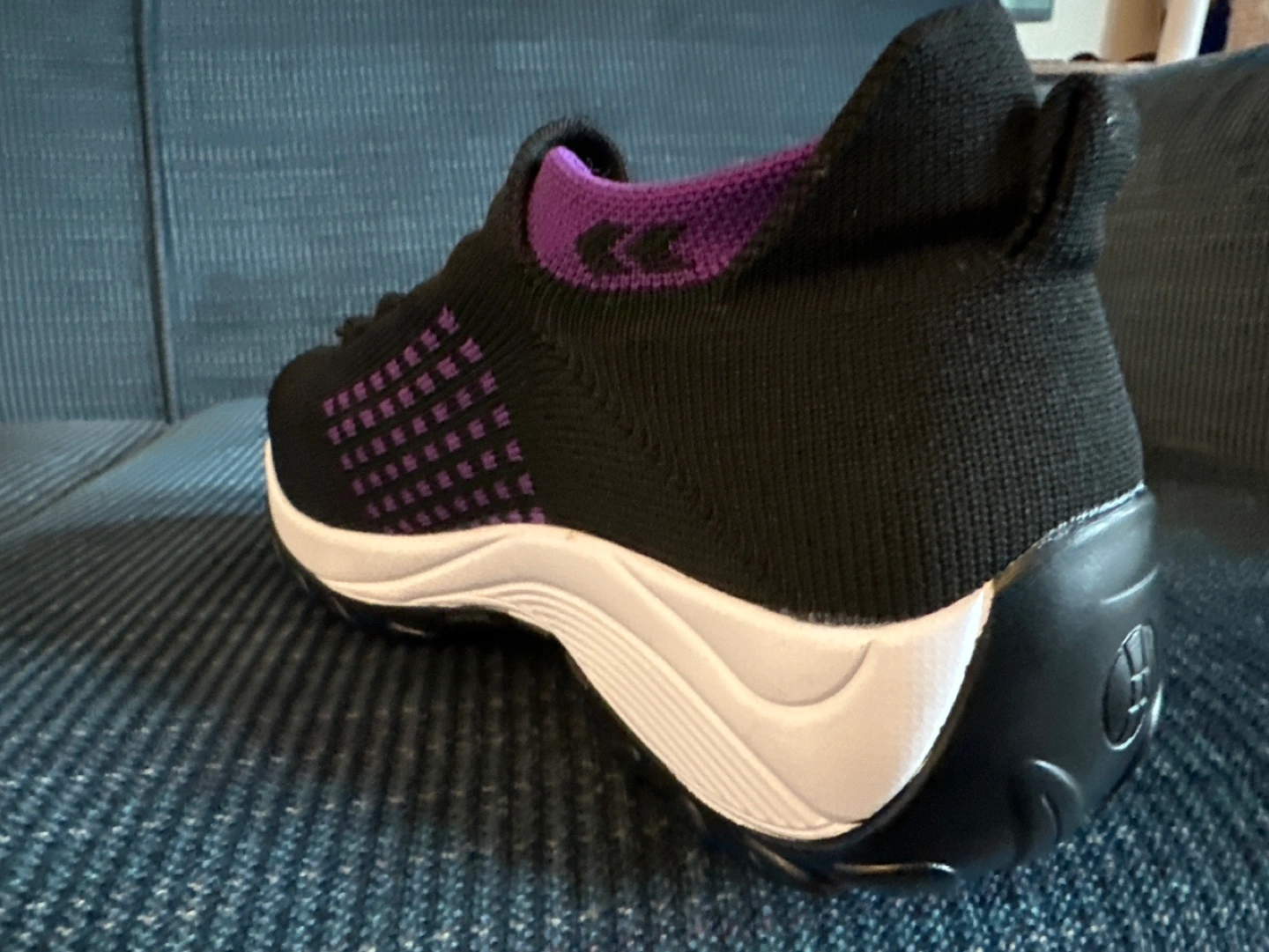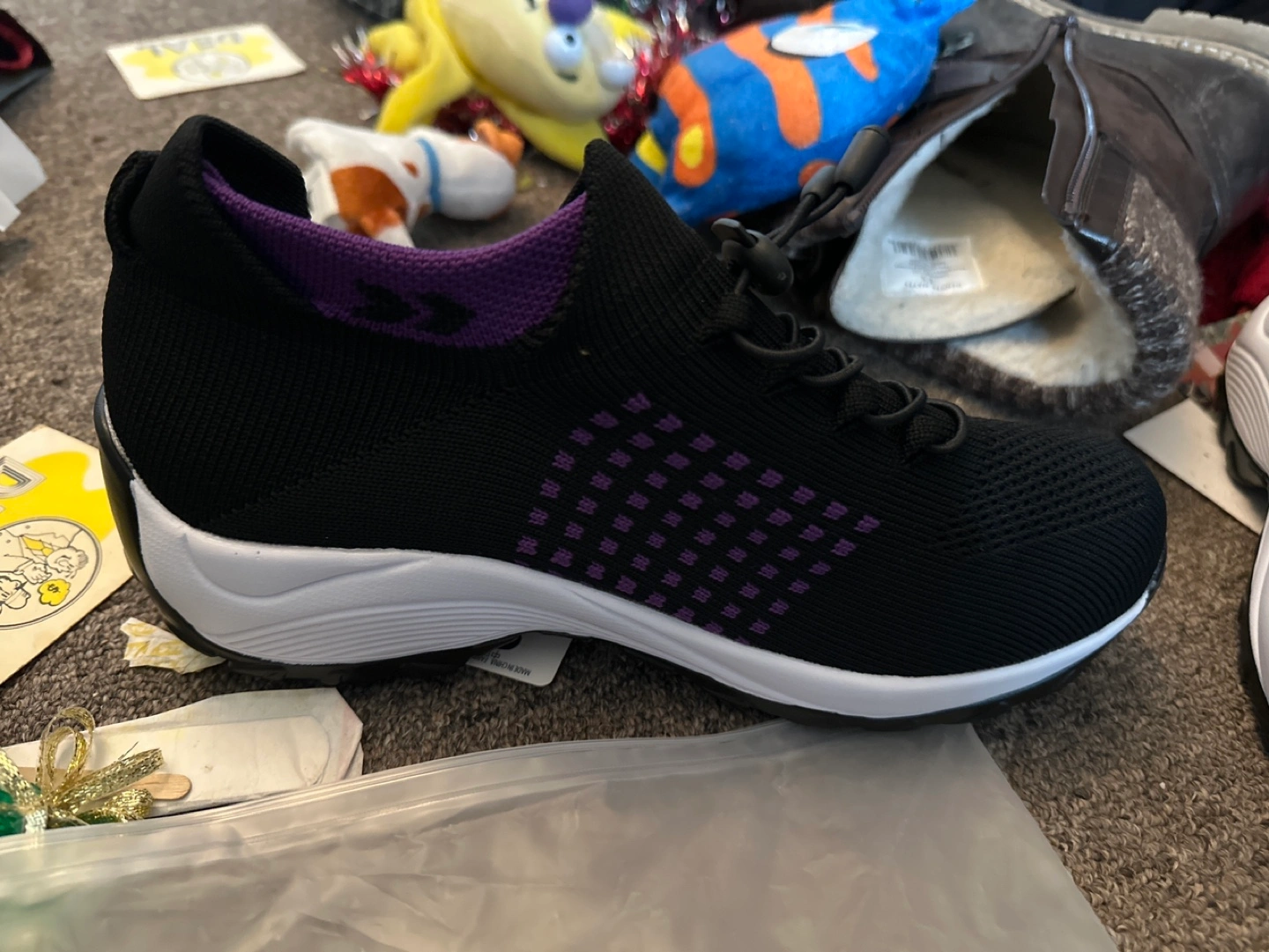 Black slip-on sneakers with purple knit detail and white soles. Features a comfortable knit upper and elastic laces.