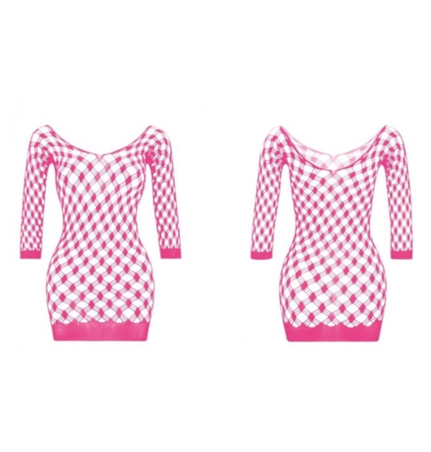Pink fishnet dress with long sleeves and a scoop neck.