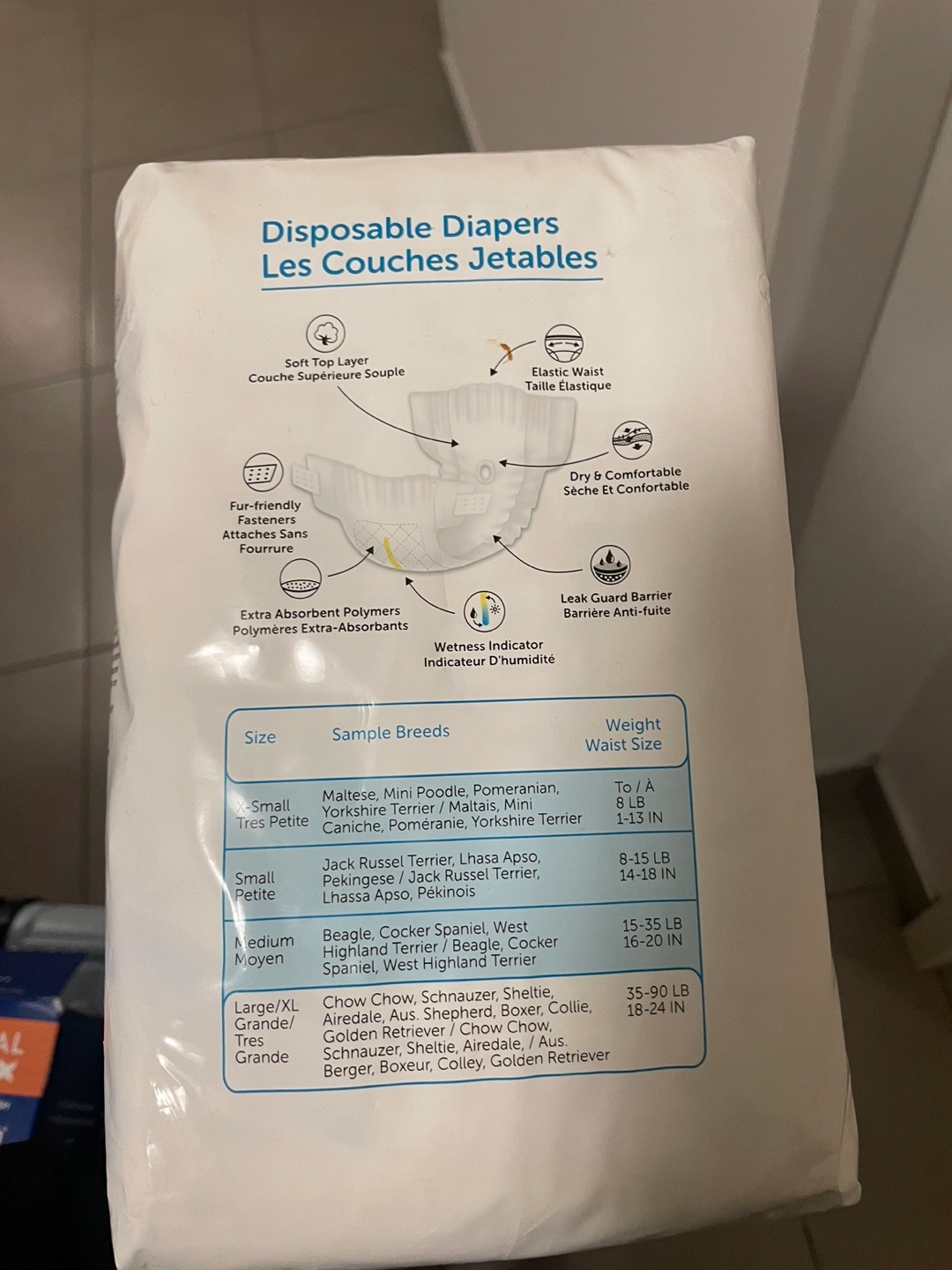 Disposable diapers for female dogs. Leak guard barrier. Wetness indicator. Adjustable tabs. Soft top layer. Dry & comfortable. Elastic waist. For dogs 15.9 - 40.8 kg (35-90 lb).
