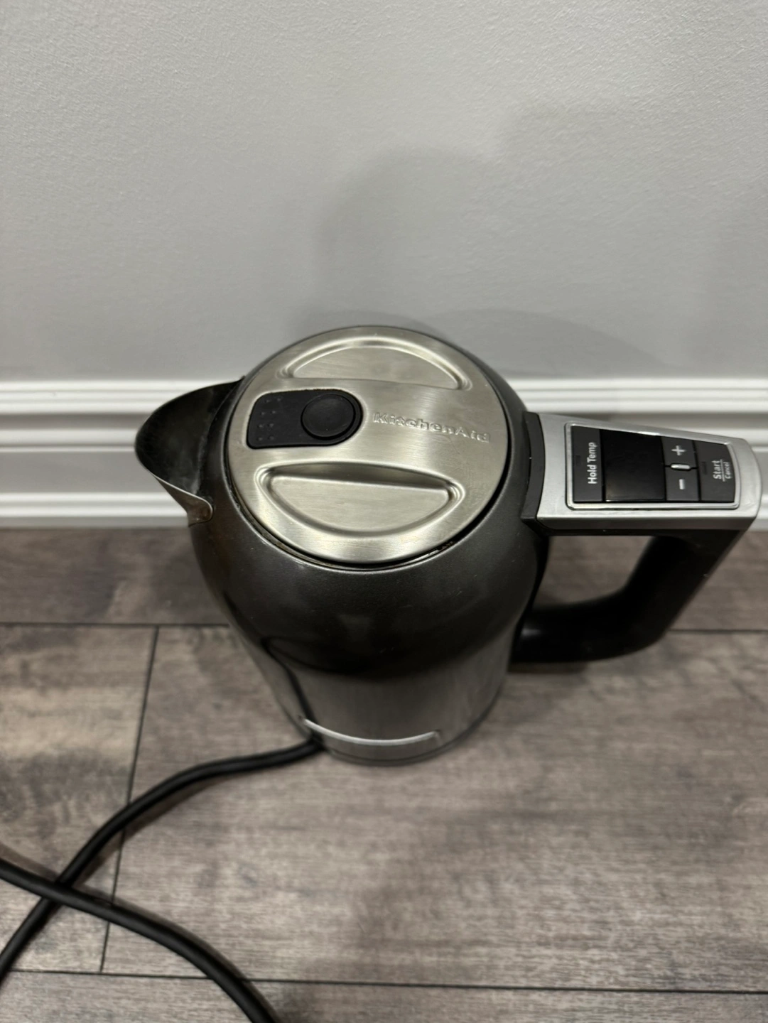 Stainless steel electric kettle with a grey finish. Includes cord. Temperature control capability. Original price 150 CAD