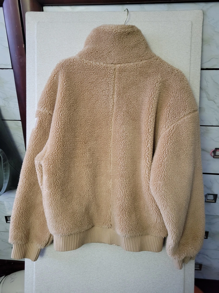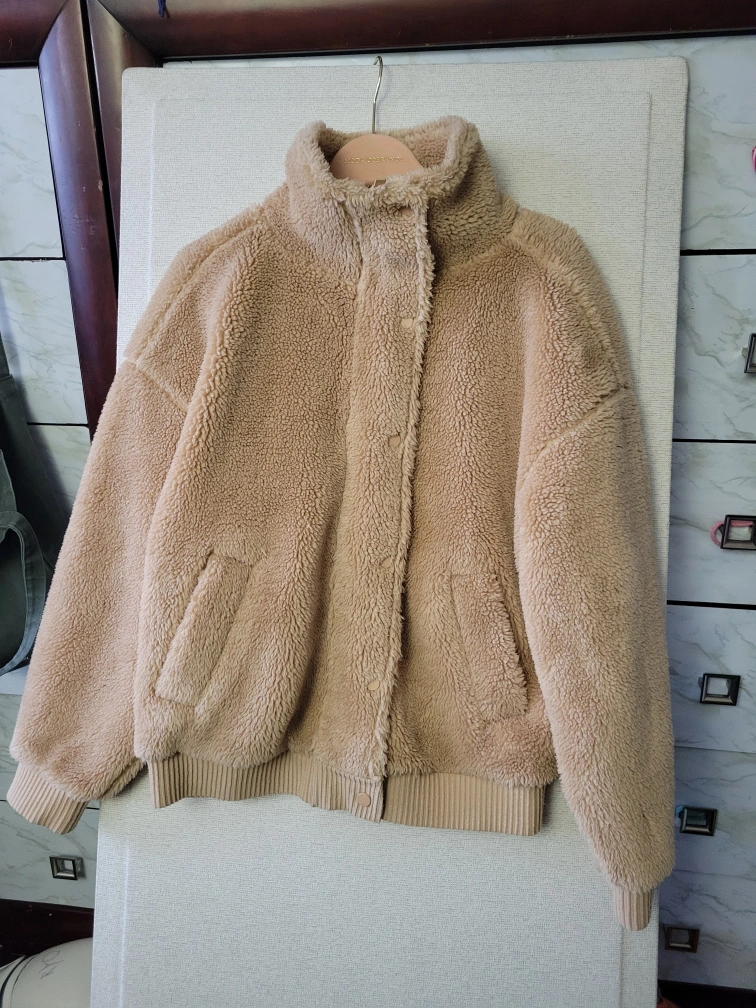 Size Small. Tan Teddy Fleece jacket with a high collar. Two front pockets. Ribbed detailing at the hem and cuffs. Button closure.