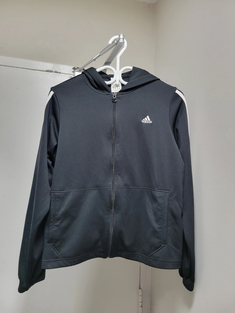 Black zip up hoodie with white stripes on the sleeves. Has a hood with a drawstring. Size XL. ( like M)