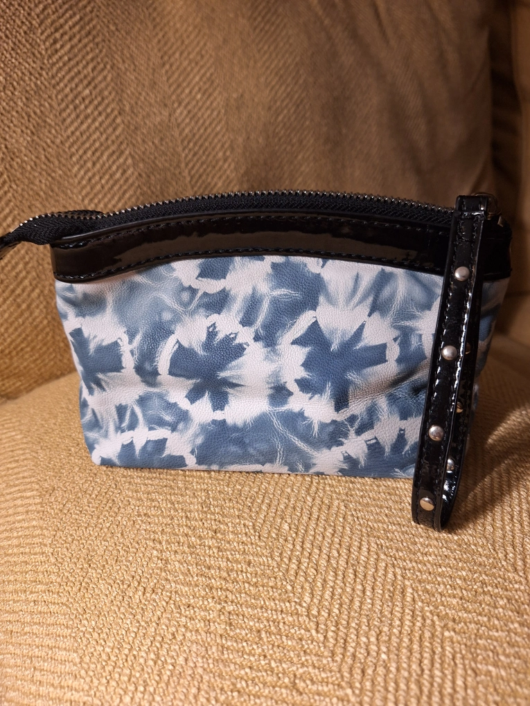 362Small clutch with a blue and white tie-dye pattern. Has a black zipper and a black wrist strap with silver studs. Cash only, picked up at Fairview Mall T&T Supermarket.