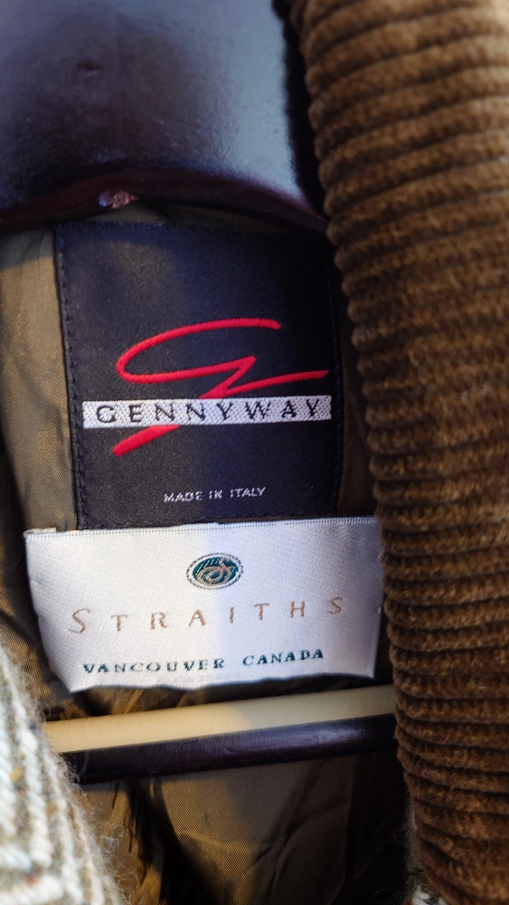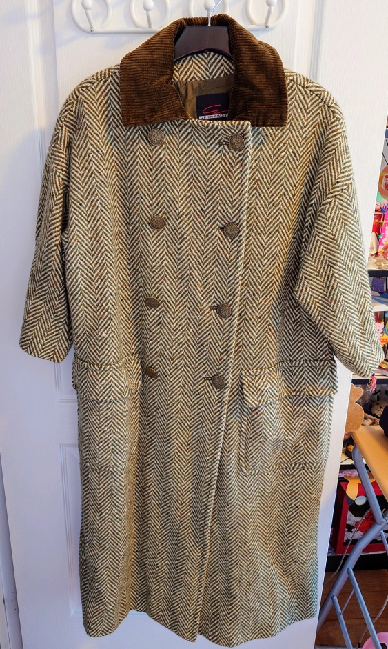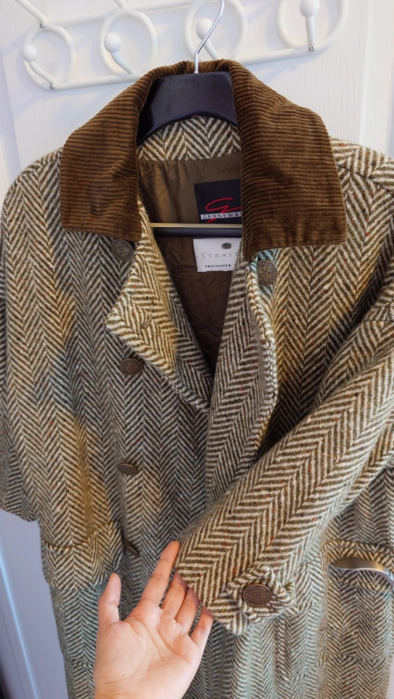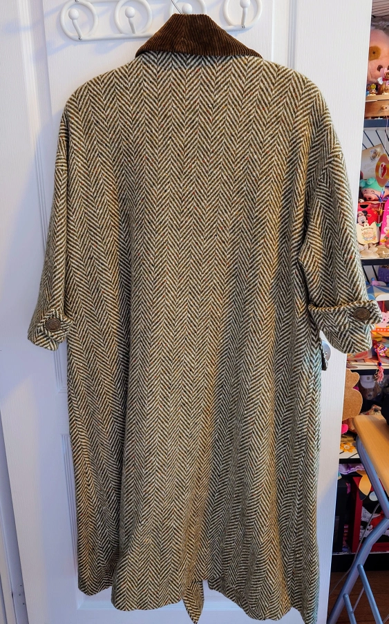 Long green tweed coat with brown corduroy collar. Purchased at $8xx.xx.