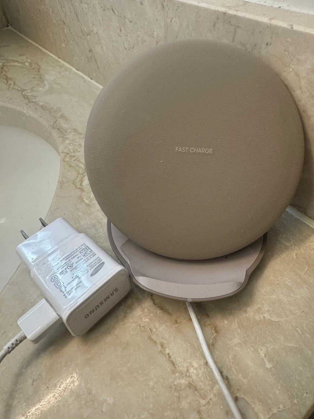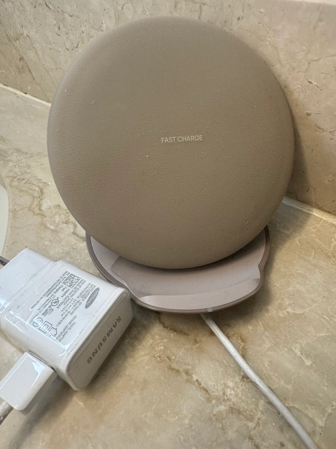 Wireless charging pad with fast charging capability. Comes with a power adapter and charging cable. Used but in good condition.