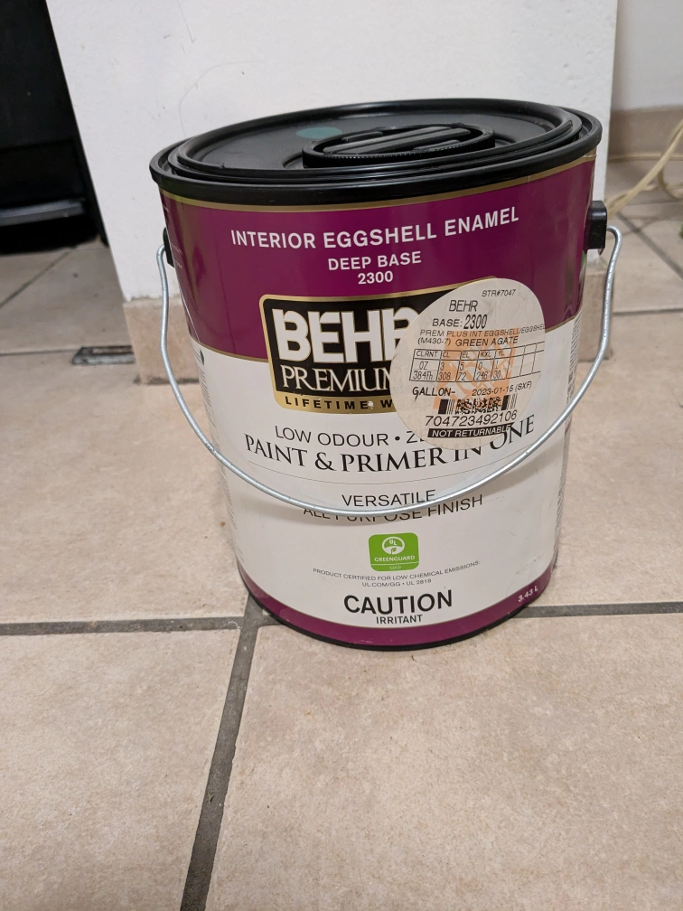 Unopened can of Behr Interior Eggshell in Green Agate.