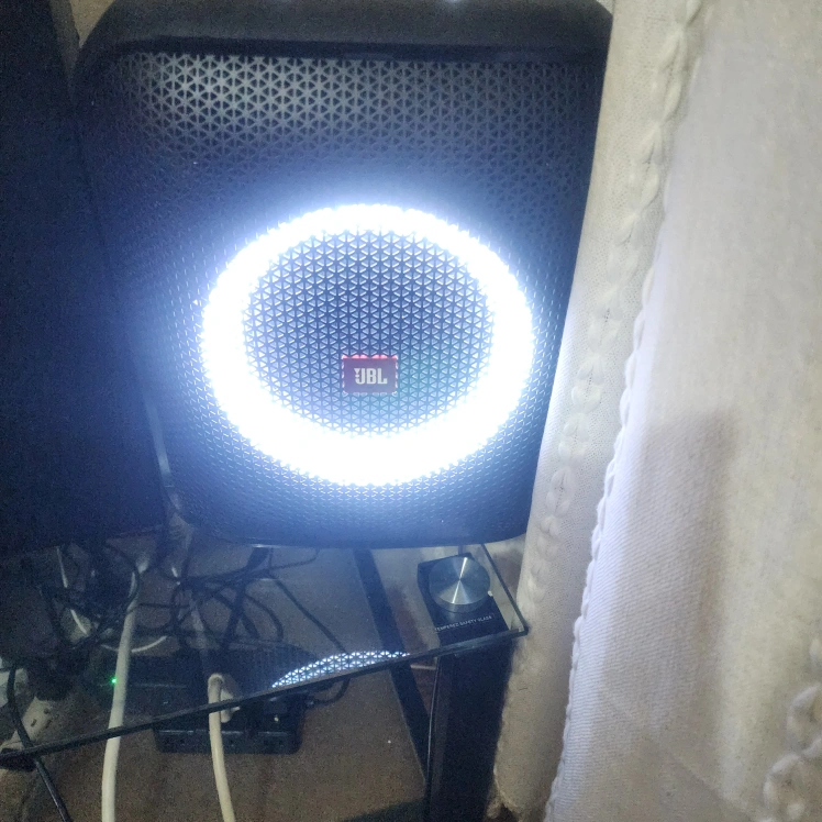 Portable JBL Bluetooth speaker with a bright LED light ring. It's great for parties and outdoor events. Black color, durable design.