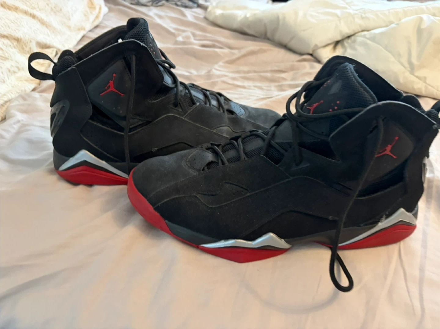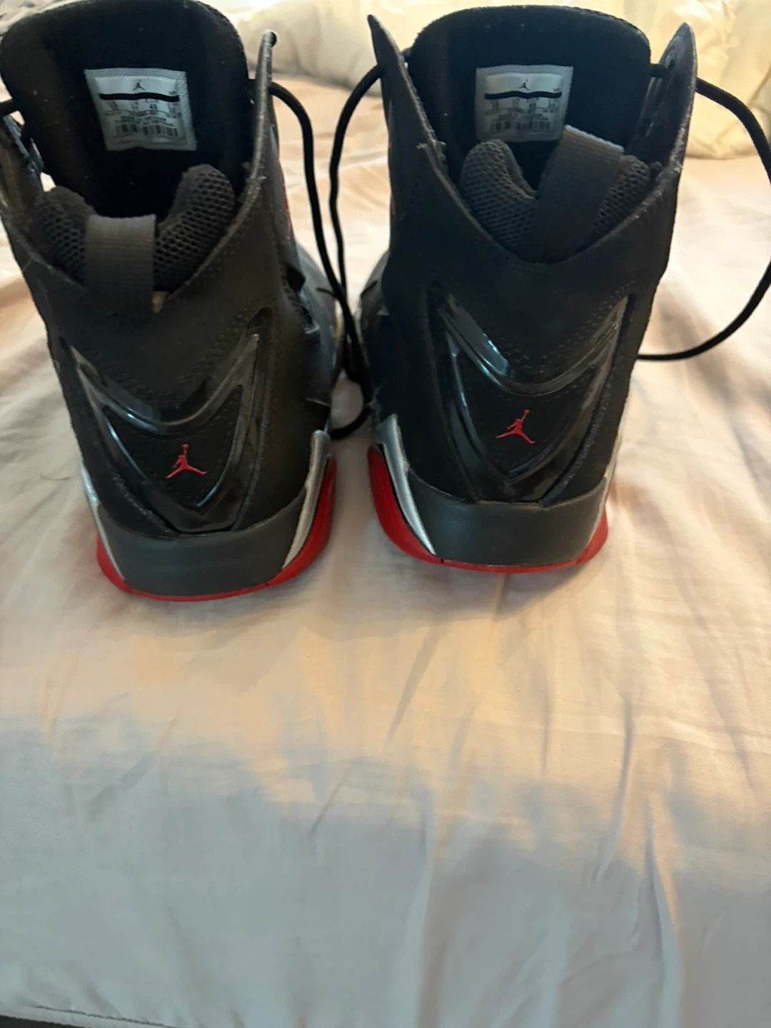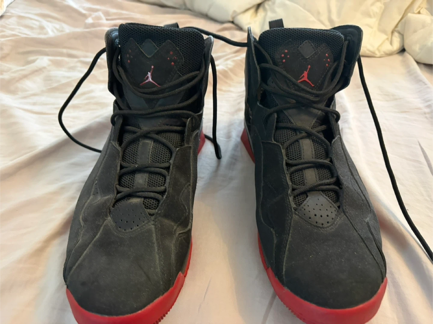 These are black and red high top sneakers from Jordan. They feature a lace-up closure and a durable sole. Great for everyday wear.