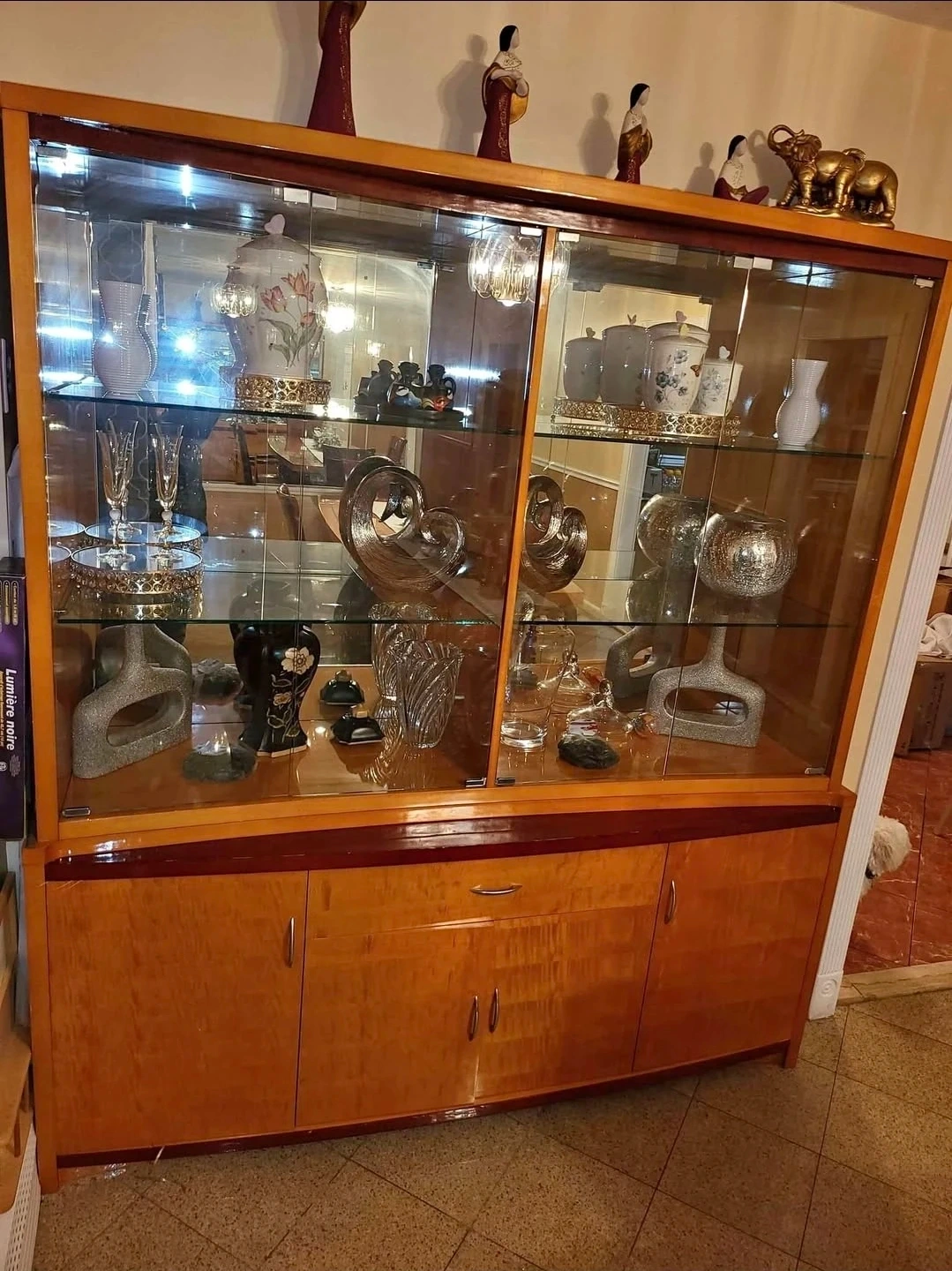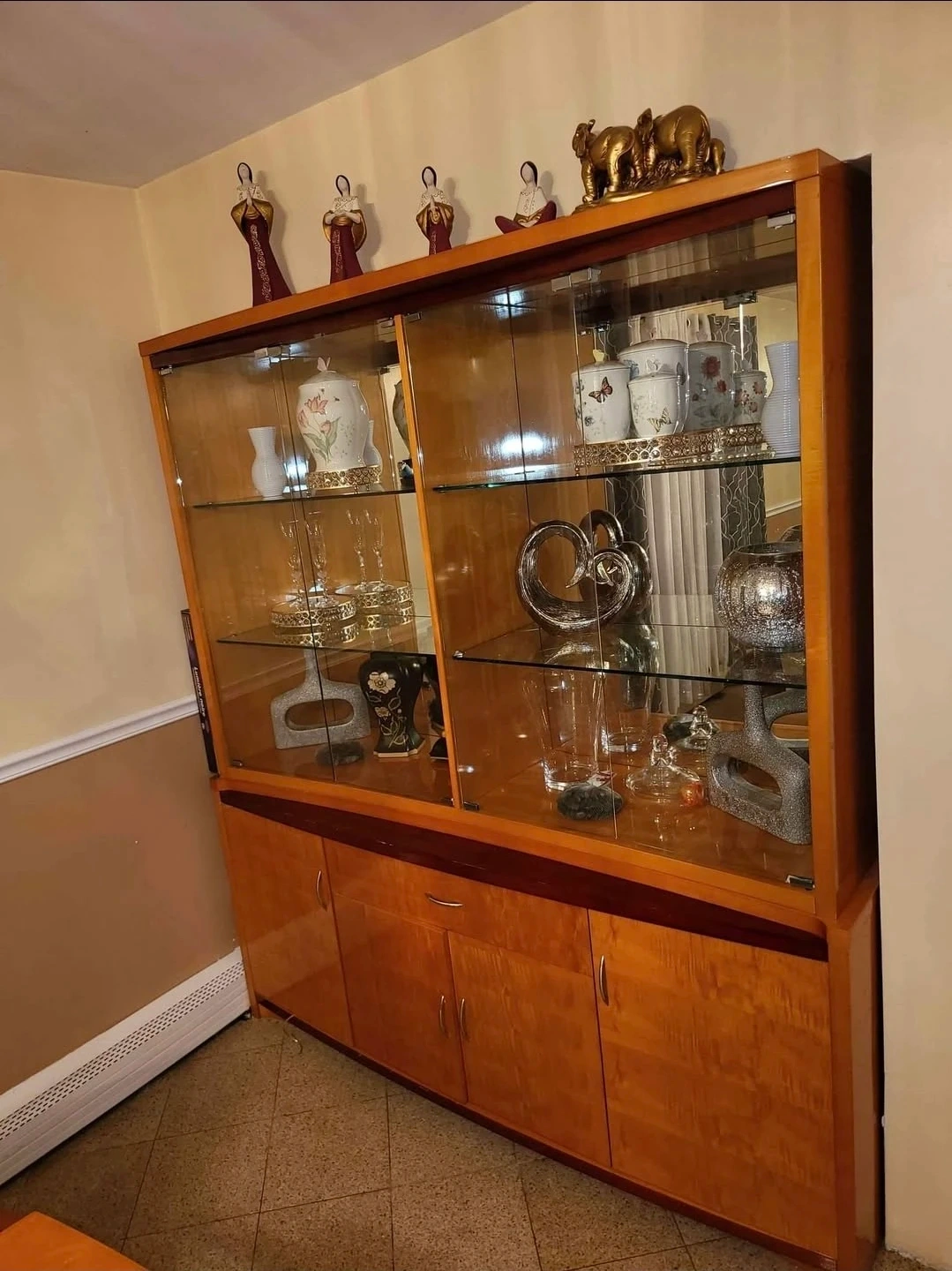 This vintage display cabinet features a rich wood finish and glass doors, perfect for showcasing your decorative items. It has multiple shelves for ample storage and display space. The bottom section offers cabinet storage with doors.