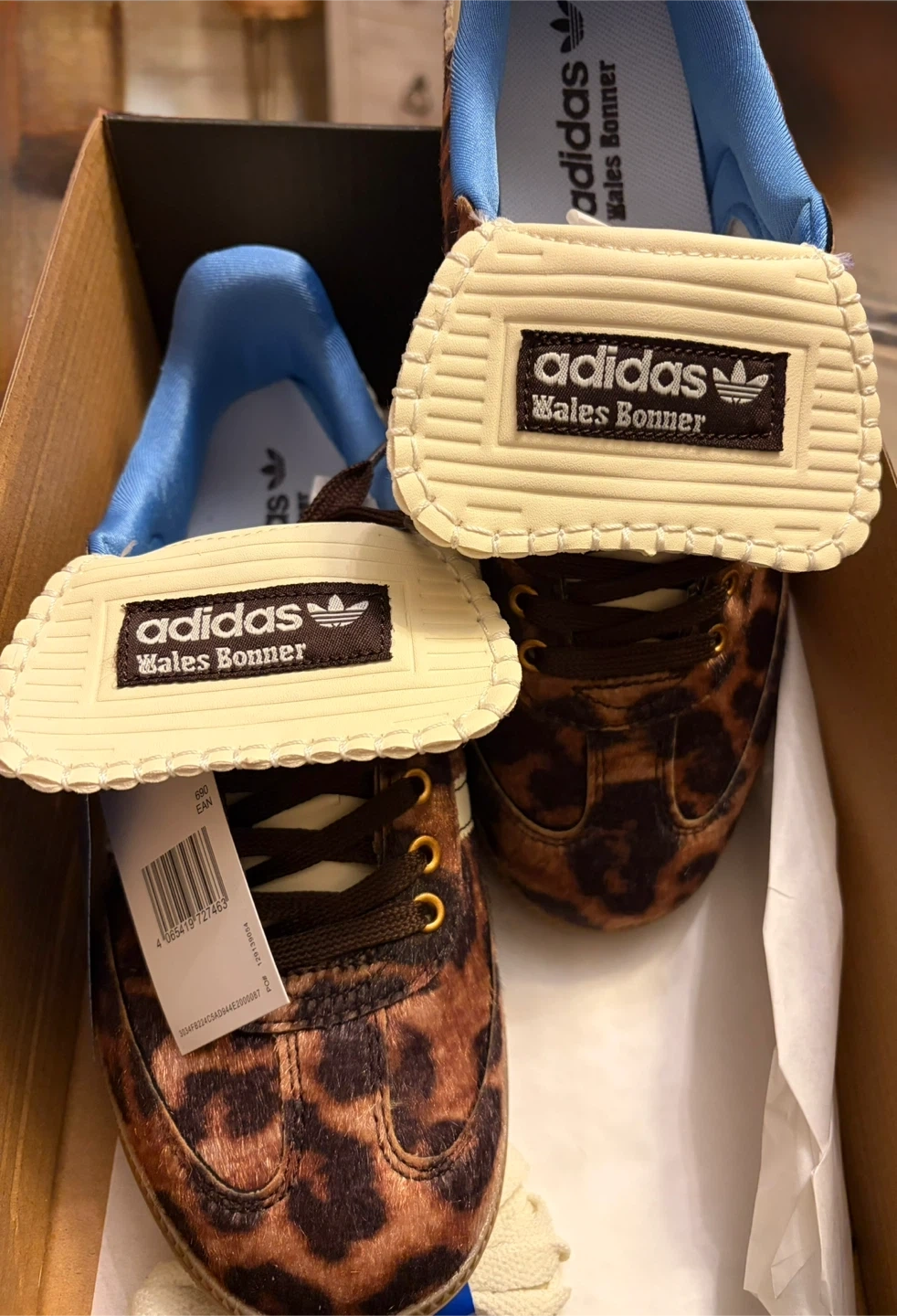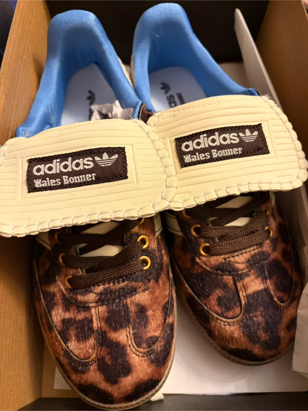 NWT Adidas x Wales Bonner Samba sneakers with a leopard print design. Includes original box and packaging. Made in Vietnam. Men size 7 . Women size 8.5 .This is a special edition , out of stock . Wales Bonner collab.