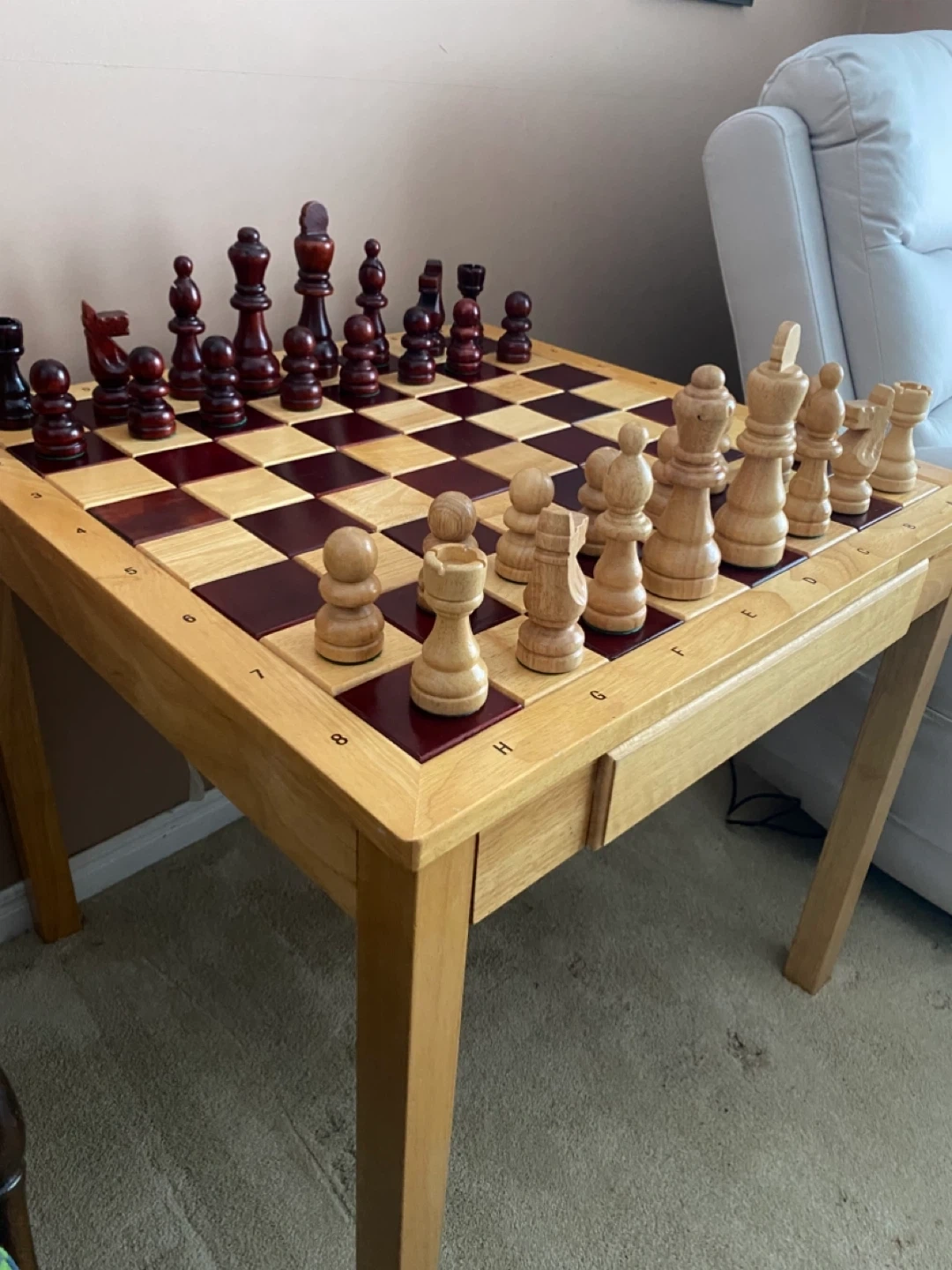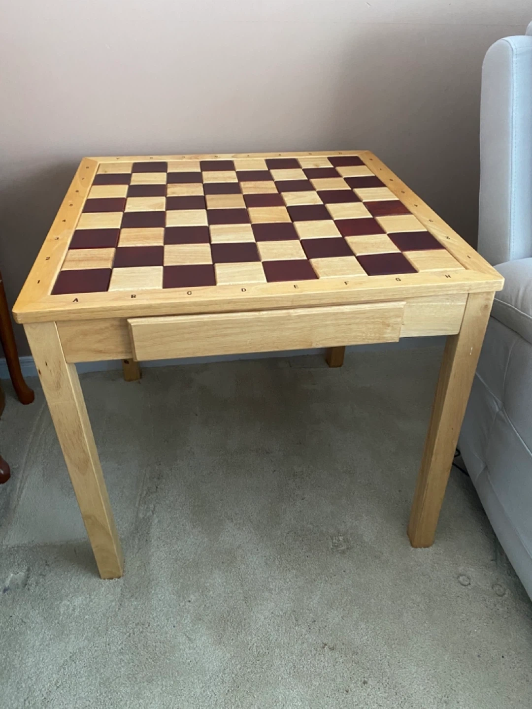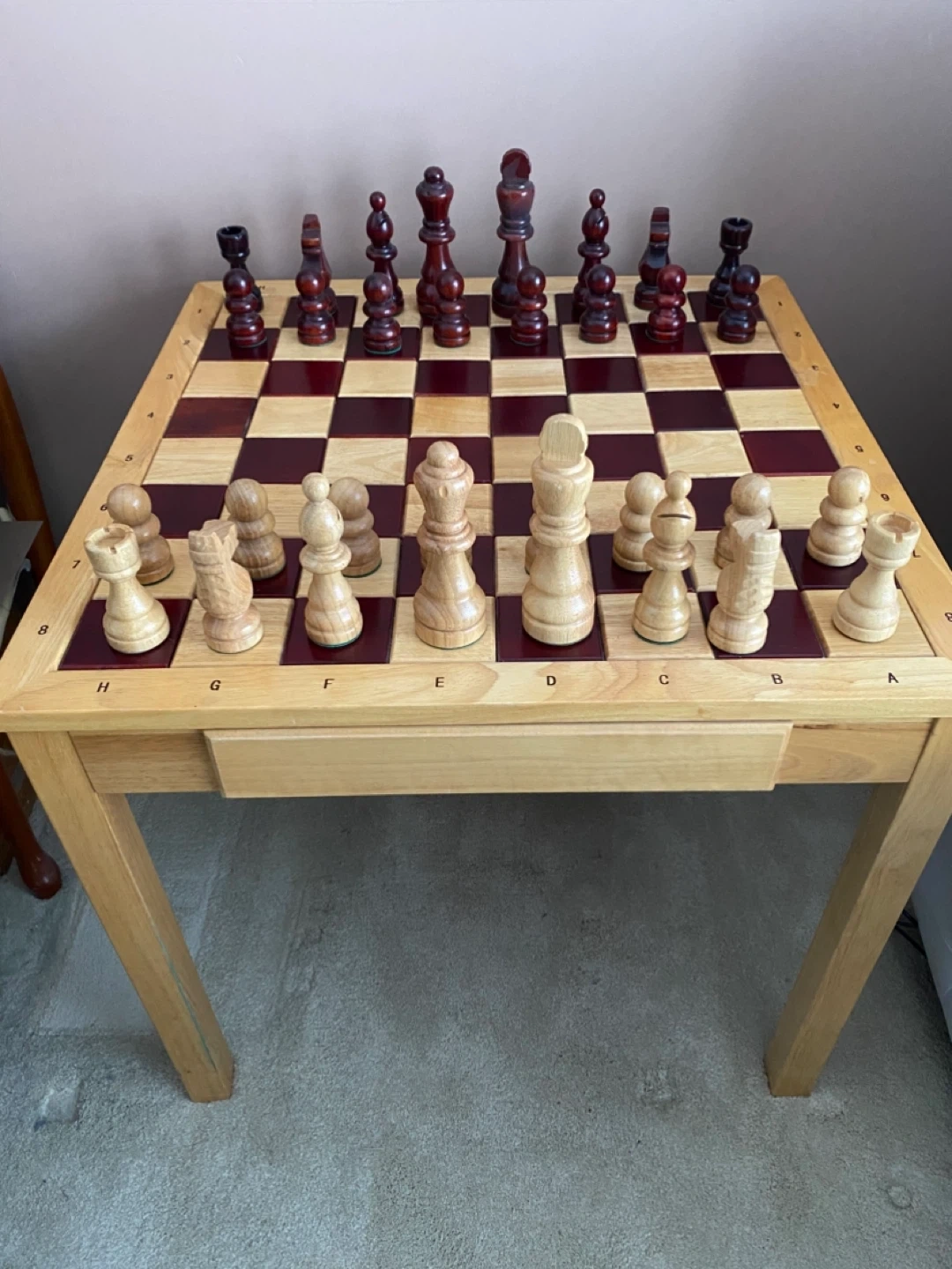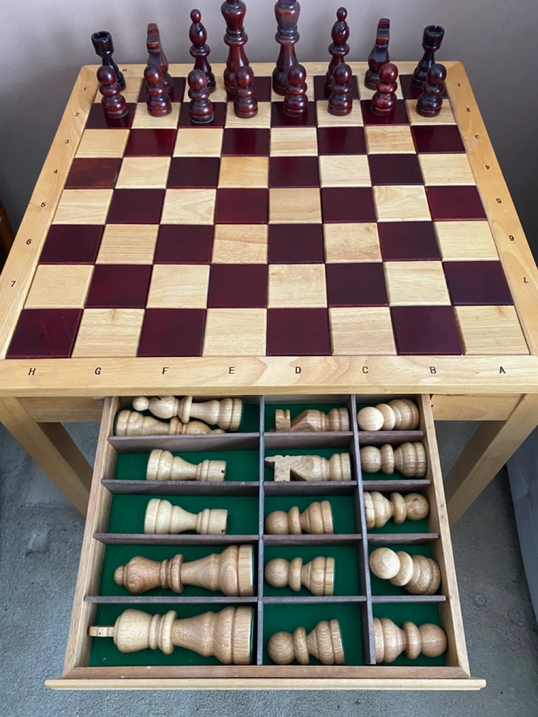 The chess table board has alternating wood tones and the sides are marked with letters and numbers for easy reference.