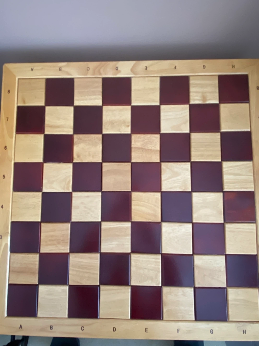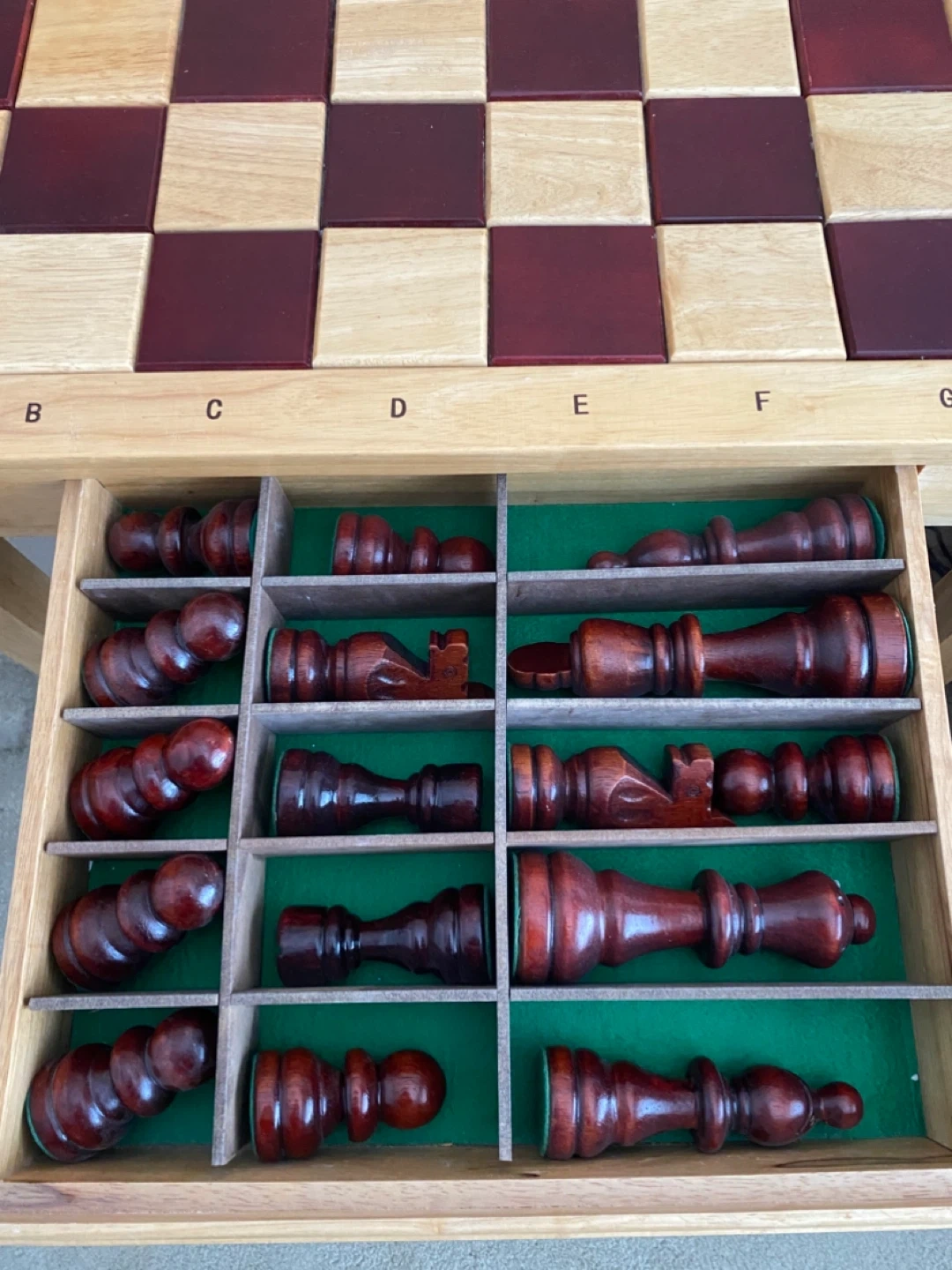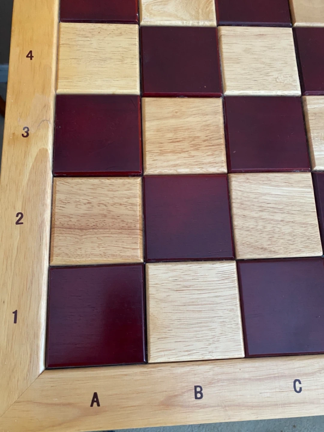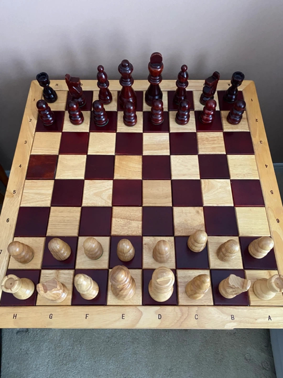 The chess table board has alternating wood tones and the sides are marked with letters and numbers for easy reference.