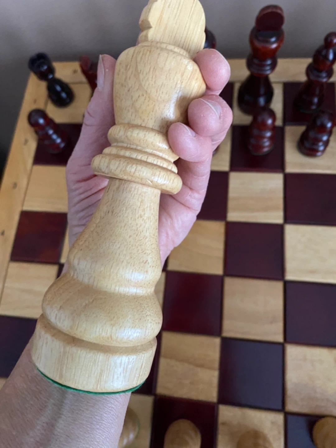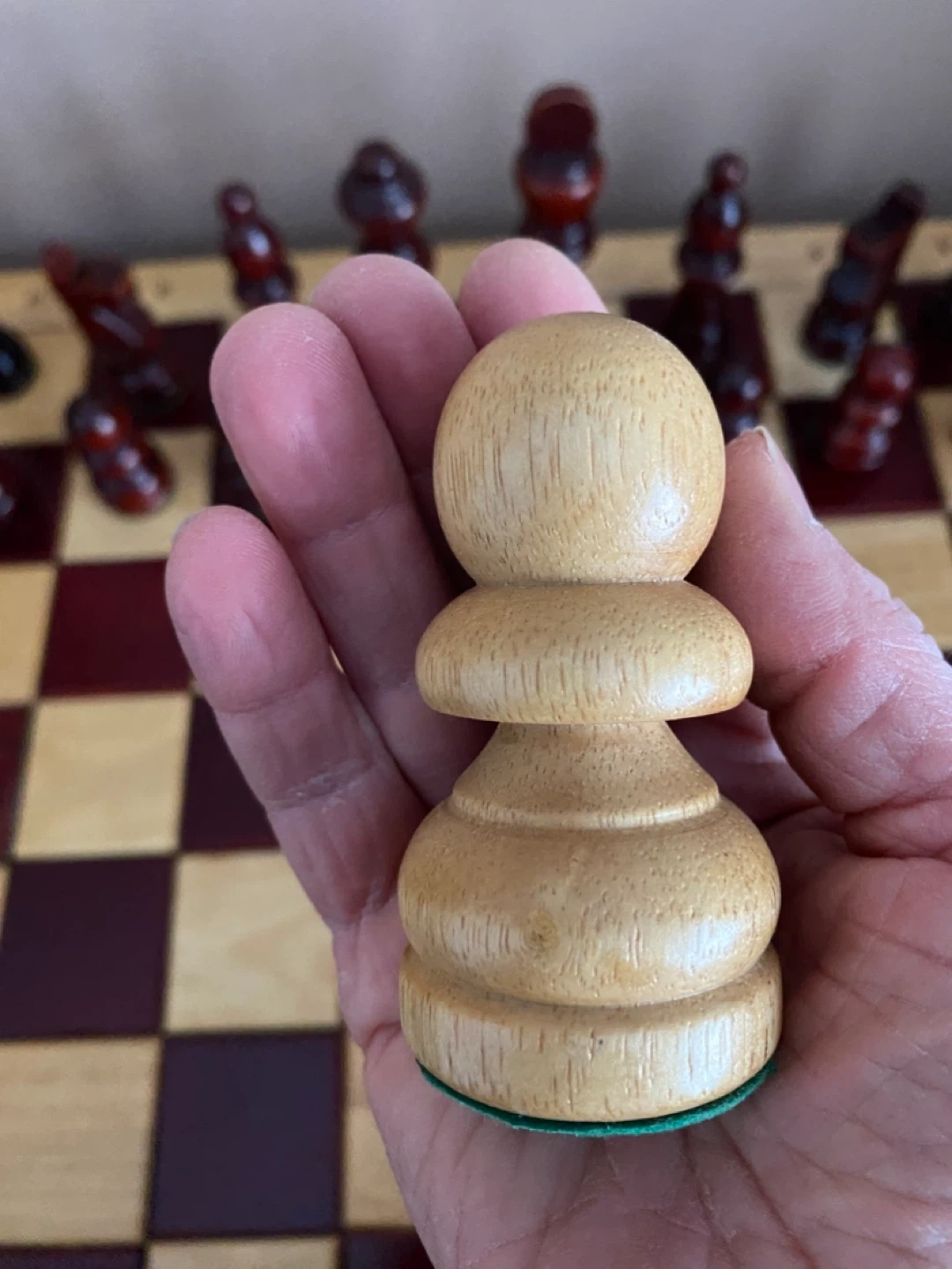 The base of each chess piece is 2” and has green felt underneath to protect the wood chess table.
