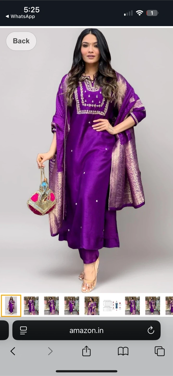 This is a vibrant purple kurta set made from silk, featuring intricate embroidery and beadwork on the neckline and scattered pearls throughout. It comes with a matching dupatta and pants. Material: Silk blend.