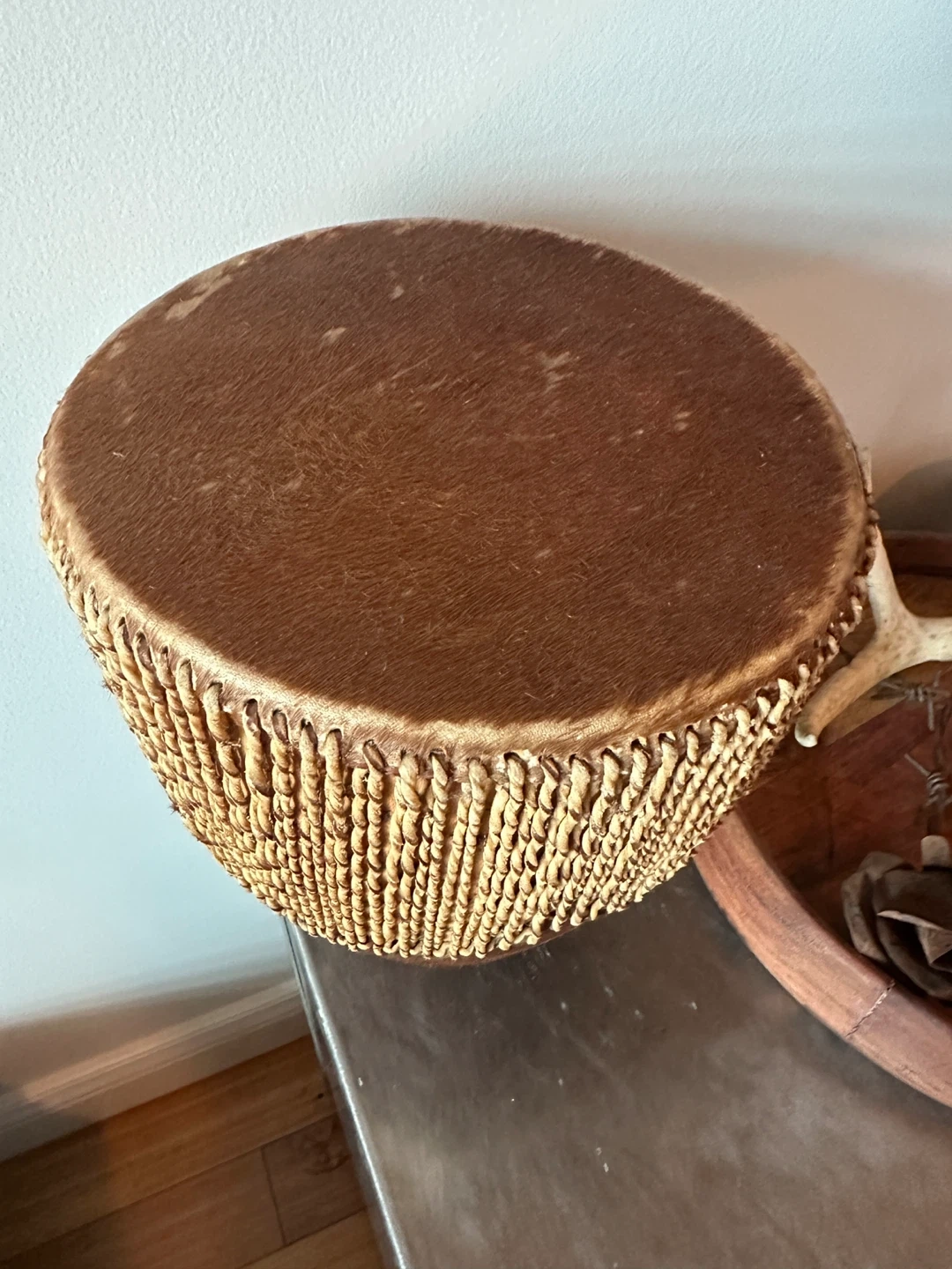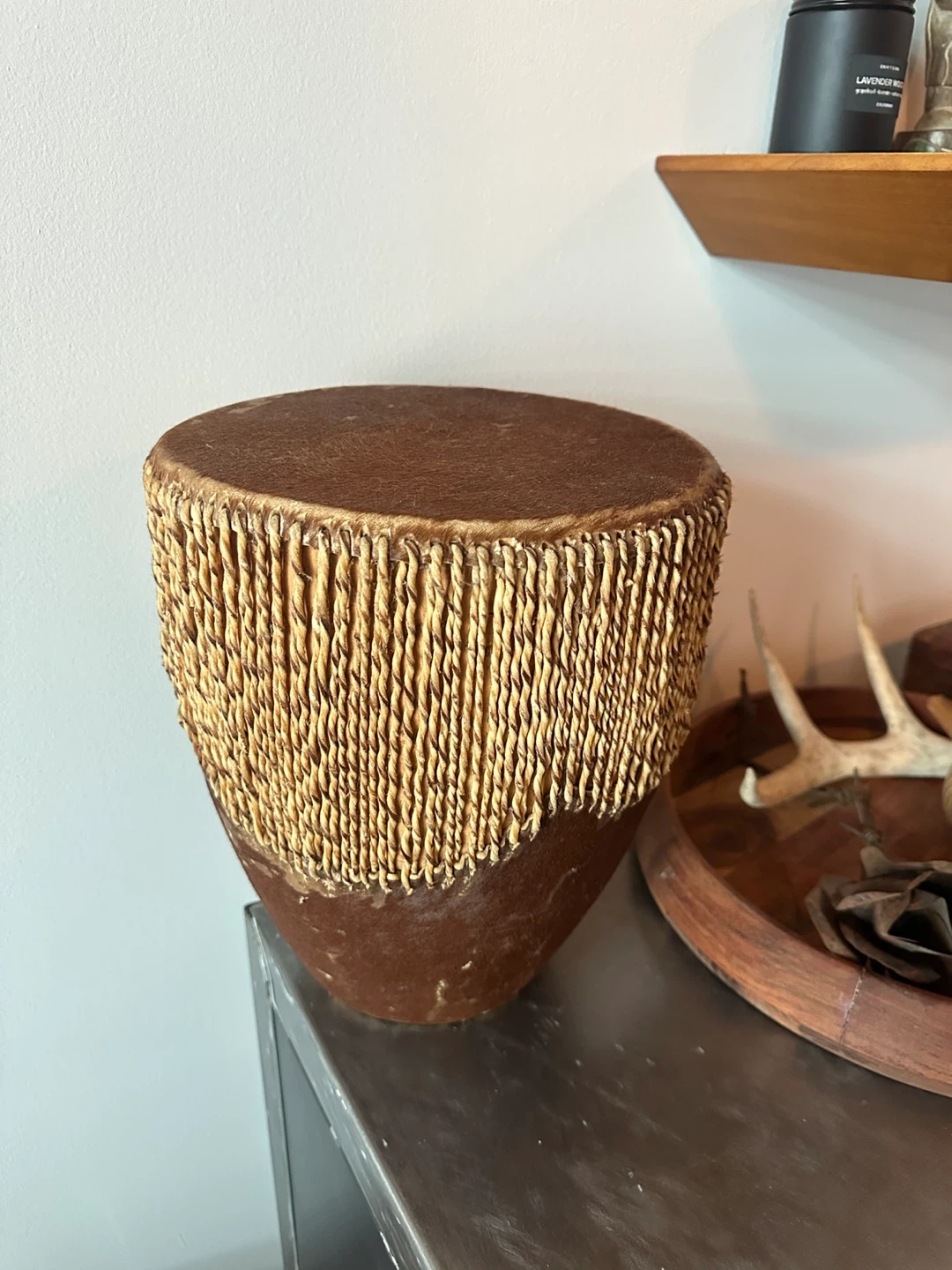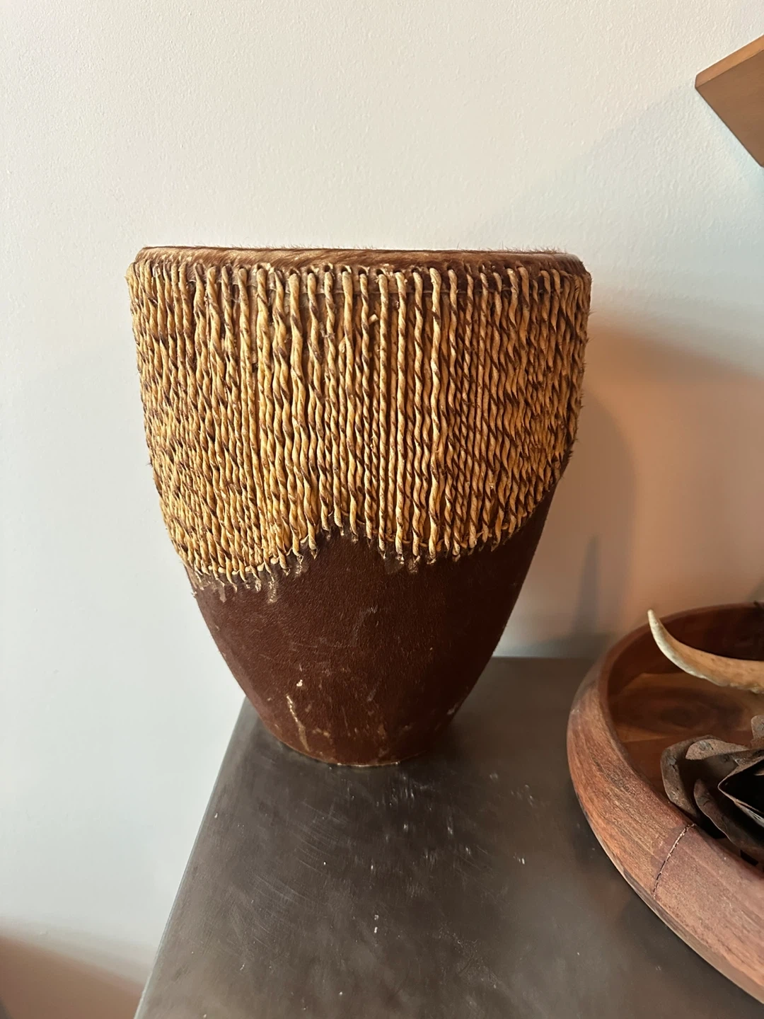 A beautiful east African hand made drum. Plays beautifully and looks great as display decor.
