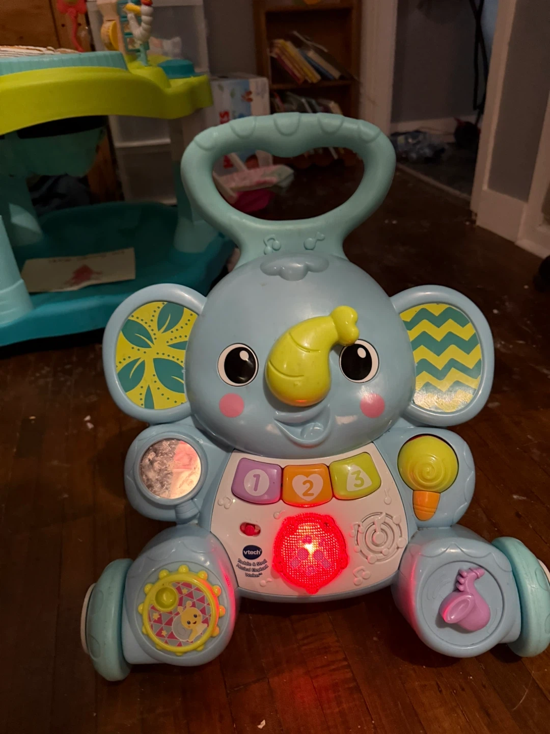 This blue VTech Toddle & Rock Musical Walker is designed for little ones. It lights up and plays music. It's a fun walker for babies starting to explore.